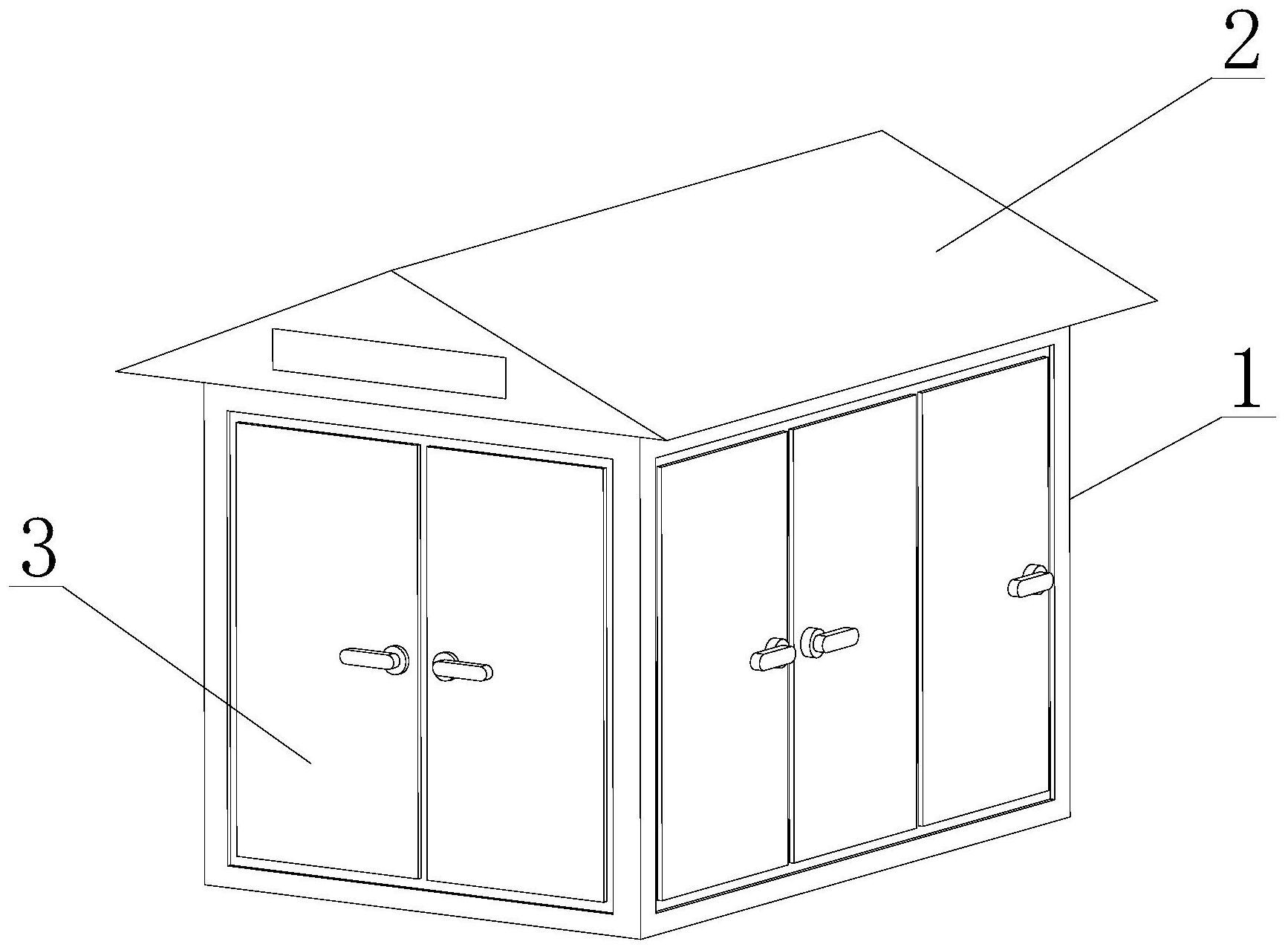 本发明公开了一种变电站主动降温装置,涉及电力技术领域,包括箱体,所述箱体的顶部固定连接有顶盖,所述箱体的外部设有开关门,所述开关门固定安装在箱体的正面和两侧,所述箱体包括主体外壳。本发明通过采用顶升装置、活动杆、挡板结合,方便在低沸点溶液受到高温汽化产生大量气体,使得内腔的顶部受到气体膨胀向上带动上顶球顶起,从而推动活动杆向上移动,在活动杆的顶部靠近永磁块时,通过永磁体与永磁块之间产生的斥力,使挡板的另一端向下翻转,使得吸热口与通风管内部连通,根据伯努利效应,空气从吸热口顶部流过时形成负压,使得吸热口能够快速地将其下方的热气抽出到通风管内,并从通风管向外界排出,从而令变电装置能够得到快速降温。