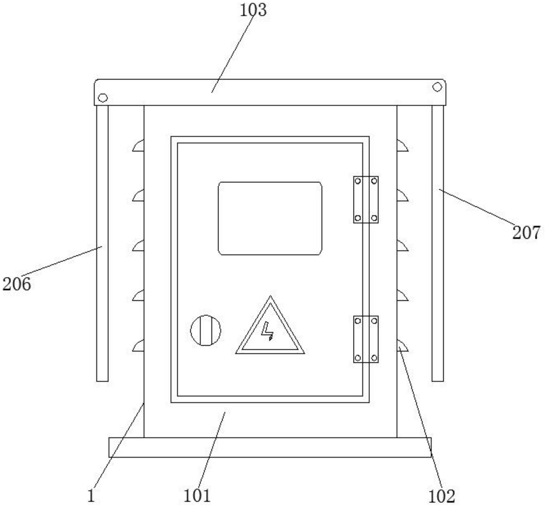 本实用新型属于电气配电柜技术领域,尤其为一种防水型室外电气配电柜,包括装置主体、调节组件和卡接组件,所述装置主体包括箱体,所述箱体的一侧设置有百叶窗,所述箱体的顶部固定连接有端盖,所述端盖的内部固定连接有调节组件,所述调节组件包括电机。通过设置调节组件对挡板进行调节,来对配电柜表面开设的百叶窗进行防护,避免雨水从百叶窗进入而造成内部元器件的损坏,通过电机带动第一挡板和第二挡板进行转动,当需要挡雨时可将挡板放置下来对雨水遮挡,当不需要进行挡雨时可将挡板收起来放置到端盖进行存放,不会影响到配电柜从百叶窗散热,这样有效保护配电柜不会受到雨水的损坏。
