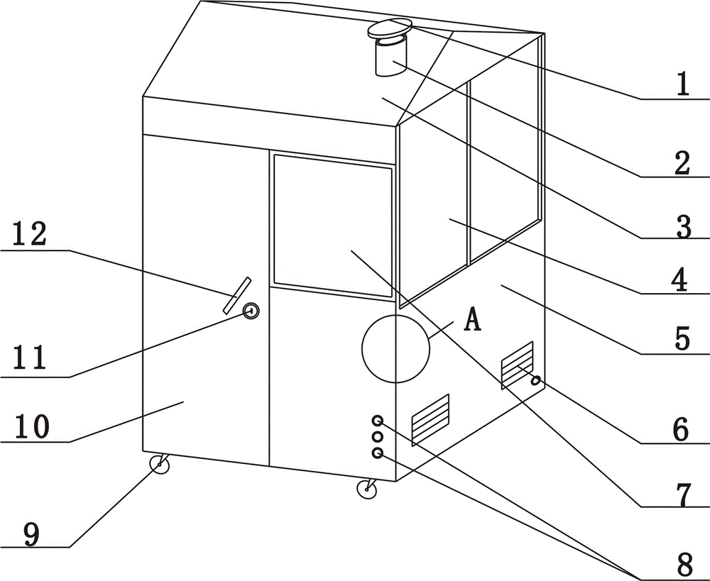 一种移动式餐饮车,涉及一种餐饮车,包括车体本体,包括由顶盖、前面板、左侧面板、右侧面板、后侧面板和下底板组成的封闭式车体,顶盖的左右侧的截面为三角形,在顶盖的上部设有通孔,在通孔上固定连接有环形圆柱状的烟囱,烟囱上部连接有挡板,在烟囱的上口两侧设有向内延伸的连接片,在连接片上设有螺纹孔,在挡板下面两侧设有螺栓分别与烟囱的上口的连接片固定连接,顶盖的左右两侧板之间设有多根支撑杆,在顶盖内部的上部固定有至少一个吊环,在左侧面板的中部上下间隔分别设有玻璃面C和推拉玻璃,在玻璃面C的中部安装有扩音器,推拉玻璃设置有多扇;本实用新型结构简单、干净整洁,有效保证了食品的卫生情况。