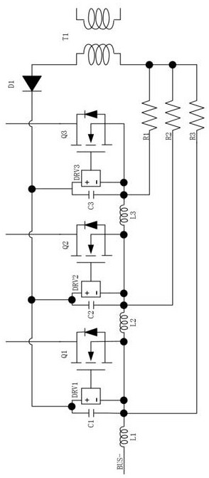 一种全桥电路下桥臂共用驱动电源电路,包括反激电源,二极管的阴极与第一电容器的第一端以及第一驱动芯片的正极连接,第一电容器的第二端和第一驱动芯片的负极与第一功率器件的集电极以及第三电阻器的一端连接,第一功率器件的门极与第一驱动芯片的驱动端连接,第三电阻器的另一端与反激电源的另一端连接。本实用新型增加了用于回路隔离的适当阻值的第一电阻器、第二电阻器、第三电阻器,形成独立的第一电源、第二电源、第三电源,第一电源、第二电源、第三电源分别以下桥臂的三个源极为参考,独立为第一驱动芯片、第二驱动芯片、第三驱动芯片供电,第一功率器件、第二功率器件、第三功率器件的栅源电压保持一致,从而获得一致的开通和关断速度。