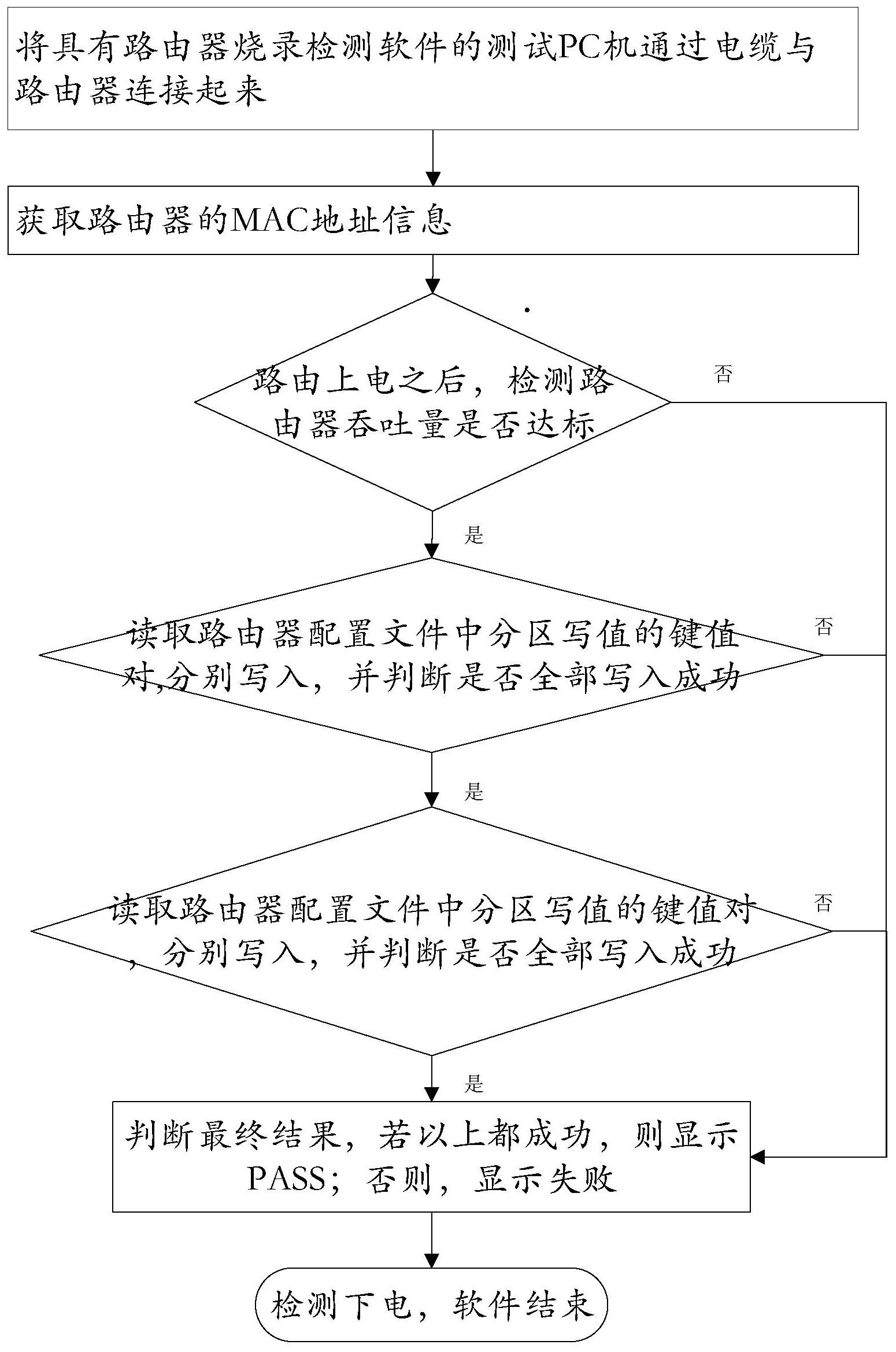 本发明公开了一种路由器生产测试烧录方法,包括以下步骤:将具有路由器烧录检测软件的测试PC机通过电缆与路由器连接;获取路由器的MAC地址信息;路由上电之后,检测路由器吞吐量;分别检测LAN口和WAN口的网络连通状况;依次写入LAN MAC、WAN MAC、WLAN MAC和5G WLAN MAC;读取路由器配置文件中分区写值的键值对,分别写入,判断最终结果,若以上都成功,则显示PASS;否则,显示失败;检测下电,软件结束。本发明采用获取路由器的MAC地址信息方式进行烧录检测,操作人员针对不同型号产品不再需要提前匹配烧录软件,可直接将烧录程序通过测试机实现烧录,减低操作难度,降低了生产成本。