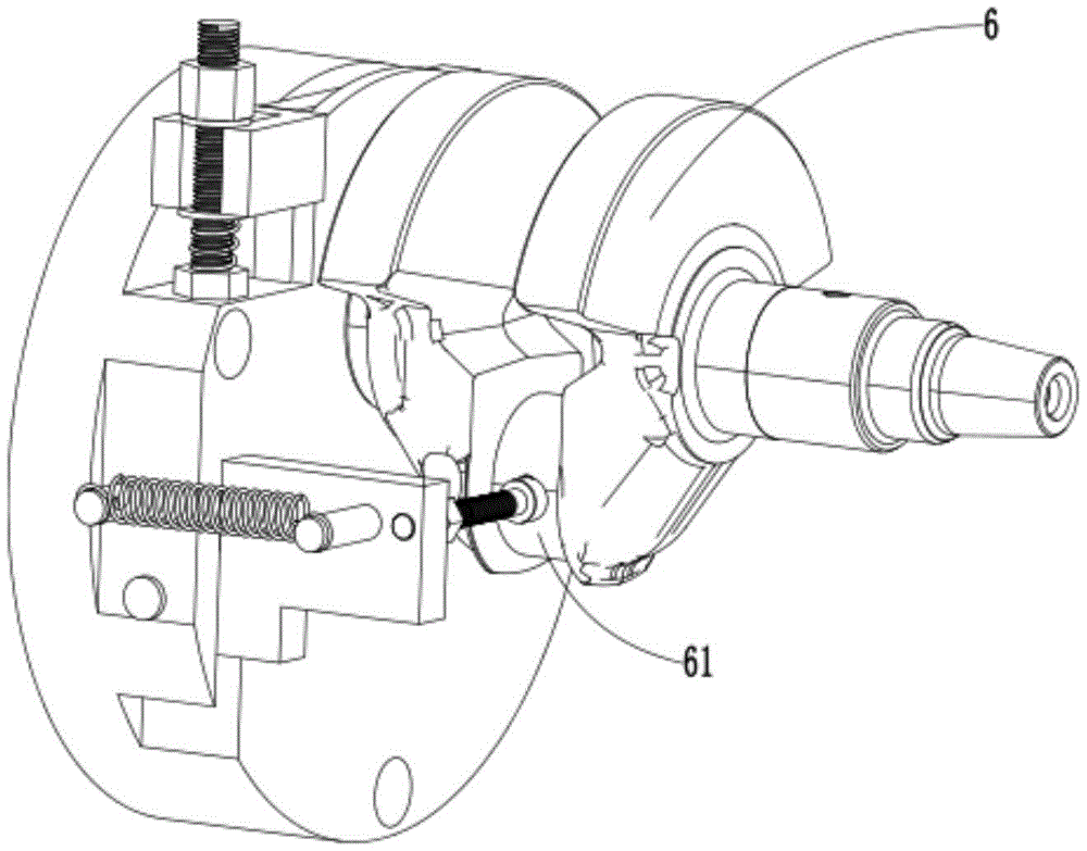 本实用新型公开了一种整体式曲轴曲拐磨削自动定位夹具,包含一圆盘状的夹具体,所述的夹具体的上部设有一可拆卸的锁紧部位,所述的夹具体的下部设有一可拆卸的导向部位,所述的导向部位上设有一可拆卸的定位部位。本实用新型的整体式曲轴曲拐磨削自动定位夹具具有以下优点:本实用新型的整体式曲轴曲拐磨削自动定位夹具能够快速高效的对曲轴进行轴向和周向的锁紧,满足生产需求,保证了曲拐磨削的加工精度,以便更好的进行产品质量管控,提升产品品质,提高生产效率。
