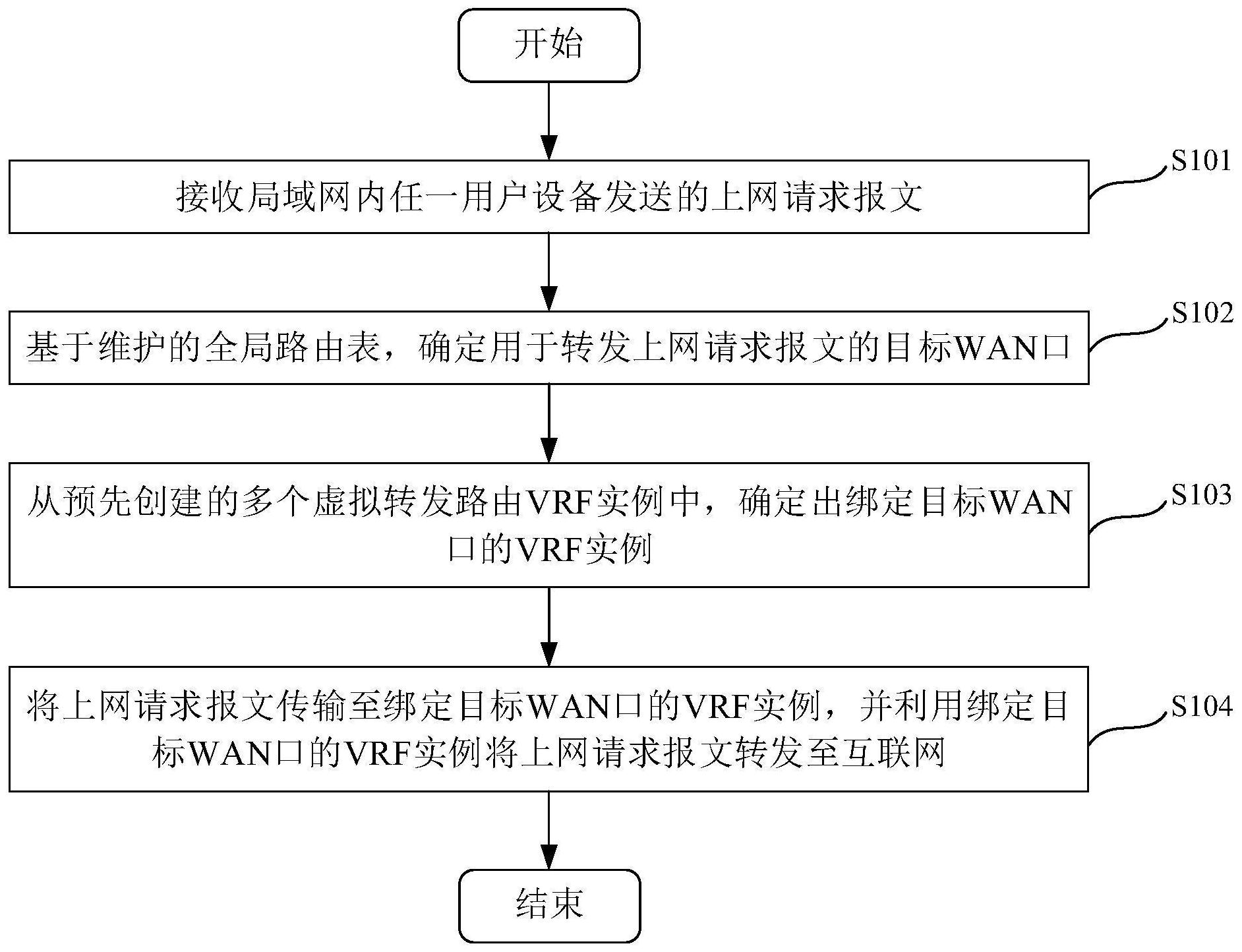 本申请实施例涉及数据通信领域,提供一种报文转发方法、装置、网关设备及存储介质,预先在网关设备中创建多个VRF实例,使得一个VRF实例绑定一个WAN口,相当于每个VRF实例都各自拥有一个WAN口,当网关设备接收到局域网内任一用户设备发送的上网请求报文时,先基于维护的全局路由表确定用于转发上网请求报文的目标WAN口,再将上网请求报文传输到绑定该目标WAN口的VRF实例,并通过该VRF实例转发至互联网。由于多个VRF实例之间是互相隔离的,即,各个VRF实例能够独立转发报文且互不干扰,因此,即使网关设备的多个WAN口被分配相同网段的IP地址,网关设备内部也能对数据报文进行正确转发。