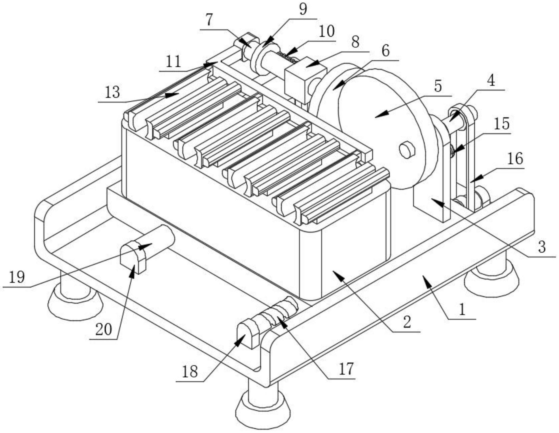 本实用新型公开了一种便于调节的圆柱滚子轴承固定装置,属于圆柱滚子轴承技术领域,其包括底座,所述底座的上表面设置有移动台,所述移动台的上表面固定连接有支撑板,所述支撑板内设置有伸缩转杆,所述伸缩转杆的外表面卡接有转盘,所述转盘的外表面与控制盘的正面搭接,所述控制盘内卡接有移动杆。该便于调节的圆柱滚子轴承固定装置,通过设置伸缩转杆、转盘、控制盘、移动杆、移动柱、传动机构和丝杆,使得移动台带动支撑板、转盘、移动杆和橡胶挤压块进行移动,使得本装置能够对多个圆柱滚子轴承同时进行夹持固定,还能够对多个圆柱滚子轴承的位置进行调整,保证了多个圆柱滚子轴承在加工过程中的稳定性,提高了工作效率。