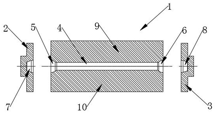 一种料棒两端胎膜镦球装置,属于锻造胎模锻技术领域,解决现有棒料端部镦球过程存在的操作复杂、工人劳动强度大、端部形状和尺寸难以控制、不适用于精密成型等技术问题。本实用新型通过以下技术方案予以实现:一种料棒两端胎膜镦球装置,其中:包括中部压紧模、左镦粗模和左镦粗模;所述中部压紧模中部水平设有料棒放置腔;所述左镦粗模设在中部压紧模的左侧;所述右镦粗模设在中部压紧模的右侧;所述中部压紧模沿料棒放置腔体的水平中轴线分为上压紧模和下压紧模。本实用新型具有结构简单、设计合理、劳动强度小、生产效率高等优点。