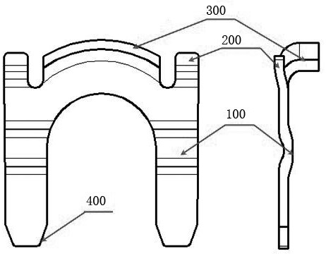 本发明公开了一种固定电机转子部件的挡片结构,挡片呈倒U型,其特征在于:前端设有横向的拱高(100),顶端设有翻面(300),顶端两侧分别设有独立翻边(200),底端的两脚分别设有左右斜边(400),独立翻边(200)与减壳体(2)贴合,拱高(100)与转子部件的轴承(301)接触。本发明通过重新设计挡片结构,在有限空间内提升挡片的弹性,提高产品合格率,大幅降低转子部件轴承的不良率,可实现自动化送料,适用于大规模生产。