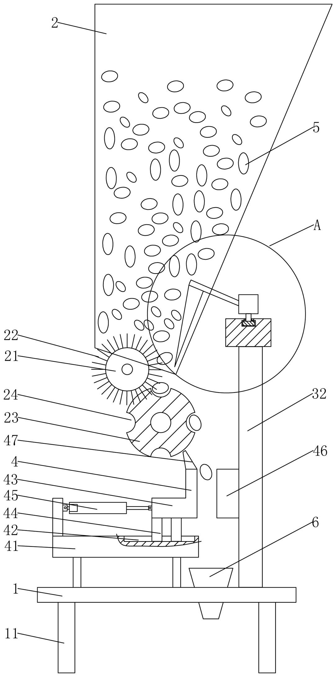 一种具有防堵塞功能的核桃加工用破壳装置,包括支撑座,支撑座的底端固定有支腿,支撑座的上方设有下料仓,下料仓的底端设有下料口,下料口处设有拨料辊,拨料辊上设有刷毛,拨料辊的斜下方设有下料辊,下料辊的圆周开设有凹槽,下料辊上方设有拨料装置,拨料装置包括下支撑梁,下支撑梁的底端固定两个支撑柱,下支撑梁的顶端开设有导向槽,下支撑梁的上方设有上支撑梁,上支撑梁的底端固定有滑块,上支撑梁上固定有拨料板支撑杆,拨料板支撑杆延伸到下料仓内,拨料杆支撑杆的端部均固定有拨料板,上支撑梁的一端设有第一电推杆,下料辊的下方设有核桃挤压装置。本实用新型结构简单,使用方便。
