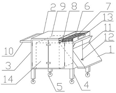 本实用新型公开了一种高粘性高膳食纤维聚葡萄糖制备用加料装置,包括加料斗和加料台,加料台下方设有支撑箱,支撑箱的底部设有支腿,支腿的底部设有万向轮,加料台的一端设有加料口,加料口内设有筛框,筛框内上设有除铁筛网和粗分筛网,除铁筛网设于粗分筛网的上方,加料斗的顶部位于筛框的正下方,加料斗连接在支撑箱上且加料斗的底部从支撑箱内倾斜伸出,支撑箱内设有活动放置的杂物箱,杂物箱与筛框的杂物出料端相对应,支撑箱远离加料斗的一端设有推拉扶手,加料台位于加料口的一端还设有震动器。本实用新型本装置移动灵活,除铁、除大块效率高,加料调整方便,有利于降低人工劳动强度并改善产品品质。
