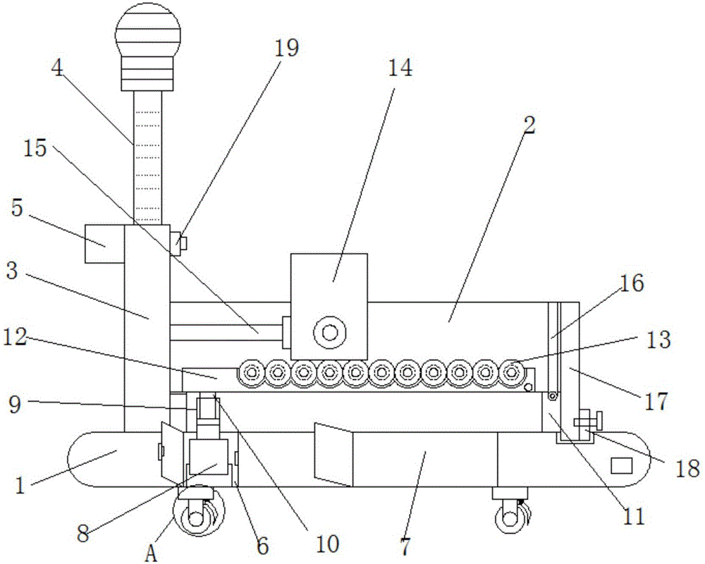 本实用新型公开了一种机电设备的运送装置,包括底板,底板的顶端中部设有箱体,箱体为侧向开口的空腔结构,箱体的一侧设有与开口相适配的箱门,箱体远离箱门的一侧设有位于底板顶端的推杆一,推杆一的顶端内部设有推杆二,推杆一远离箱体的一侧顶端设有固定机构,底板的一侧设有容置仓和位于容置仓一侧的收纳仓,容置仓的内部底端设有气泵,气泵的输出端设有母管,母管的内部穿插有子管,箱体的内部底端两侧分别均设有支撑座,支撑座的顶端设有支撑板。有益效果:通过打开活动板和箱门,使得机电设备在旋转辊上进行滚动,有效的减少了对机电设备底部的摩擦,大大保护了机电设备,本设计简单合理,使用方便,为机电设备的运送带来了方便。