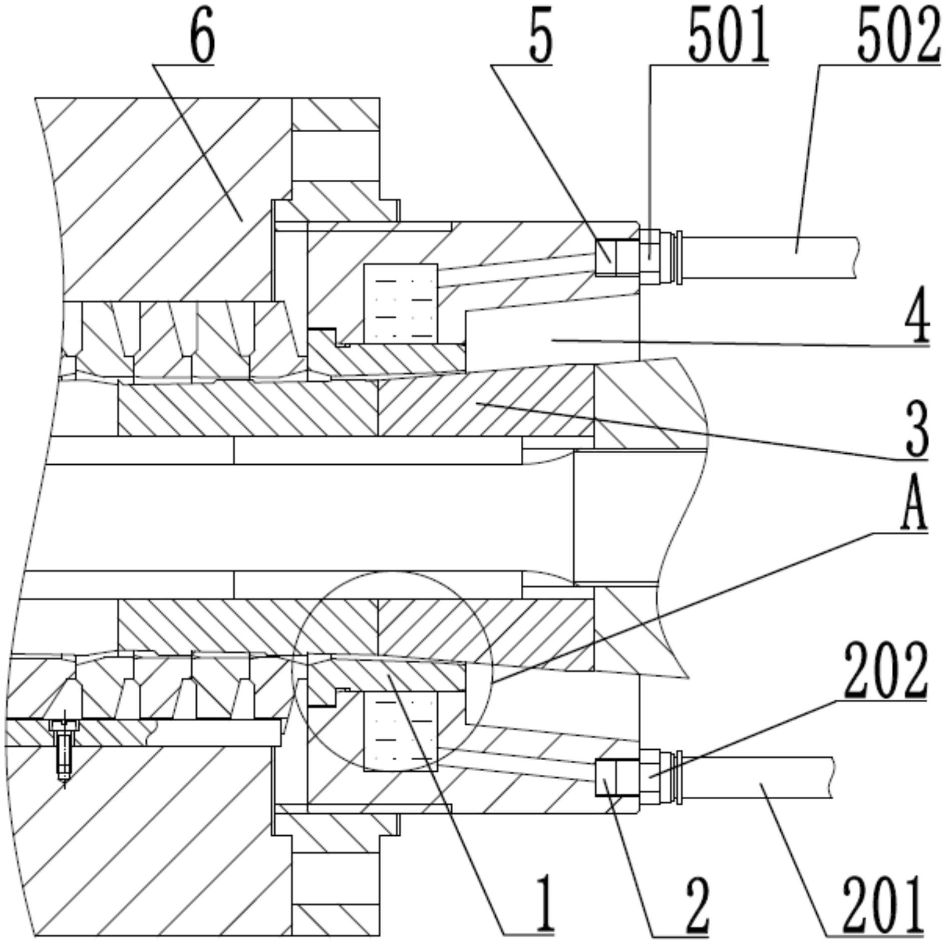 本实用新型涉及机械榨油领域,其具体地公开了一种榨油机水冷出料机构,用于对榨油机出料位置进行降温、散热,该机构包括调饼头、套接在调饼头上的出饼圈和套接在出饼圈上并固定在榨笼装置上的压紧螺母,调饼头与出饼圈之间的间隙形成出饼处;压紧螺母内从左到右依次设置有与压紧螺母同轴的第一内孔、第二内孔,第一内孔孔壁上设置有与第一内孔同轴的环形槽,压紧螺母的端口处设置有第一水口和第二水口,压紧螺母内设置有与环形槽和第一水口相连通的第一过水管道,压紧螺母内设置有与环形槽和第二水口相连通的第二过水管道;本实用新型能够有效的降低枯饼的温度,改善枯饼的成形状况,提高原料的利用率。