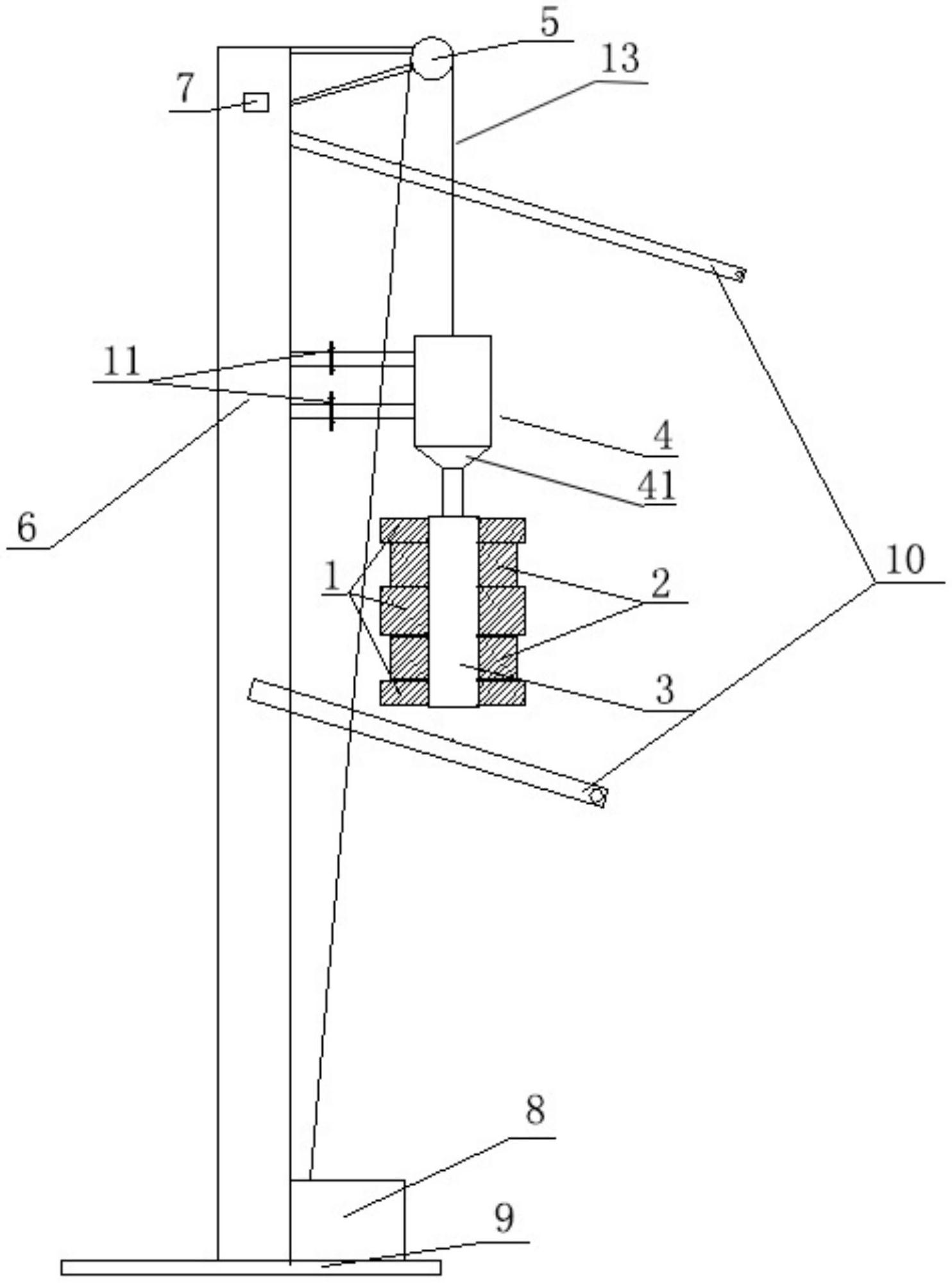 本实用新型公开了一种六面顶压机销轴用重力自动顶出装置,包括底座、导轨、卷扬机、重力锤,导轨与底座呈垂直固定连接,导轨上端通过支撑架安装有导轮,导轨两侧安装有连接杆,通过连接杆把六面顶压机销轴用重力自动顶出装置与六面顶压机连接,卷扬机安装在底座上,重力锤与卷扬机之间连接有钢丝绳,钢丝绳绕过导轮与重力锤顶端连接,导轨内安装有滑动组件,轴承架伸出导轨的一端通过法兰盘与重力锤连接,导轨上设有行程感应开关,行程感应开关与卷扬机之间电连接,行程感应开关能感应到重力锤的运动位置,本实用结构简单,易操作,提高工作效率,节约了成本,拆装方便,适合不同型号的六面顶压机。