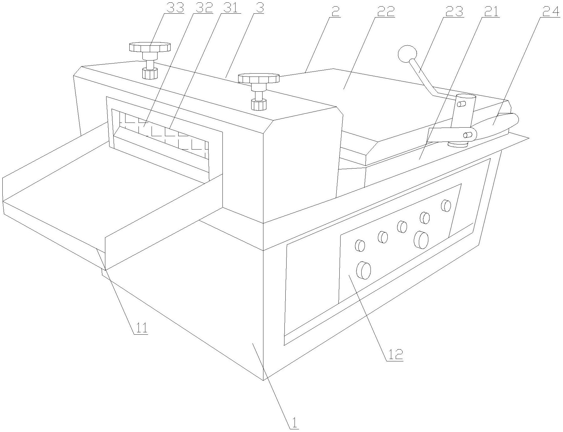 本实用新型公开的是一种紫菜加工用新型烤紫菜机,包括机箱、烤紫菜组件和裁切槽体,烤紫菜组件和裁切槽体分别固设于机箱的后侧和前侧,机箱内侧设置有伺服电机和发热电机且分别与裁切槽体和烤紫菜组件连接,烤紫菜组件包括底座和盖体,底座前侧设有卡紧扣,卡紧扣活动卡紧盖体,裁切槽体内侧装设有裁刀组件。本实用新型通过机箱顶部的前后侧分别设置裁切槽体和烤紫菜组件,实现紫菜的烘烤和裁切,提高加工效率,节约人工;烤紫菜组件的底座和盖体设有发热电丝,可进行双面烘烤,提高口感;通过裁切槽体内置裁刀组件,并可根据产品厚薄度通过调节旋钮调节,简单实用,本实用新型结构新颖,简单实用,能够很好提高产能,适合推广。