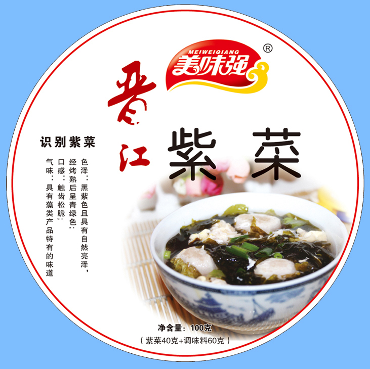 1.本外观设计产品的名称:紫菜包装(美味强)。2.本外观设计产品的用途:本外观设计产品用于包装紫菜。3.本外观设计产品的设计要点:在于产品的形状及图案的结合。4.最能表明本外观设计设计要点的图片或照片:主视图。5.省略视图:其他视图无设计要点,故省略其他视图。