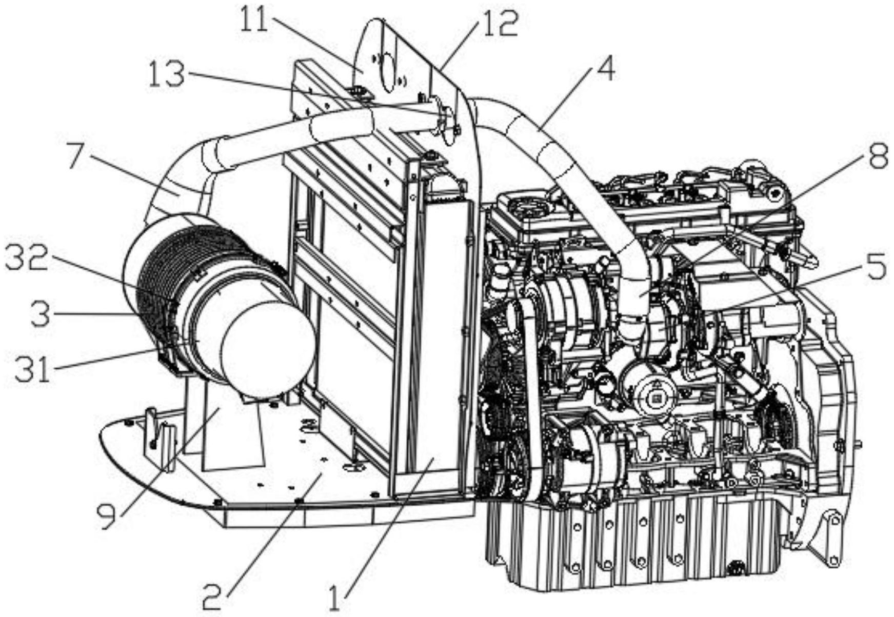 本实用新型涉及一种进气系统布置结构,包括散热器、散热器支架、空滤器、进气管、增压器,所述散热器通过散热器支架设置于拖拉机前端,所述增压器设置于散热器一侧并与拖拉机连接,所述空滤器设置于散热器支架上,所述进气管一端与空滤器连接,另一端向靠近散热器的一方延伸并越过散热器上方与增压器连接,所述散热器上还设置有护风圈、连接板,所述护风圈上端、连接板下端对应设置有弧形槽,所述护风圈与连接板连接,所述护风圈上端弧形槽与连接板下端弧形槽形成圆形通孔,所述进气管设置于圆形通道内,所述圆形通孔与进气管外边缘相对应。本实用新型旨在提供一种进气管不漏气、安装布置合理的进气系统布置结构。