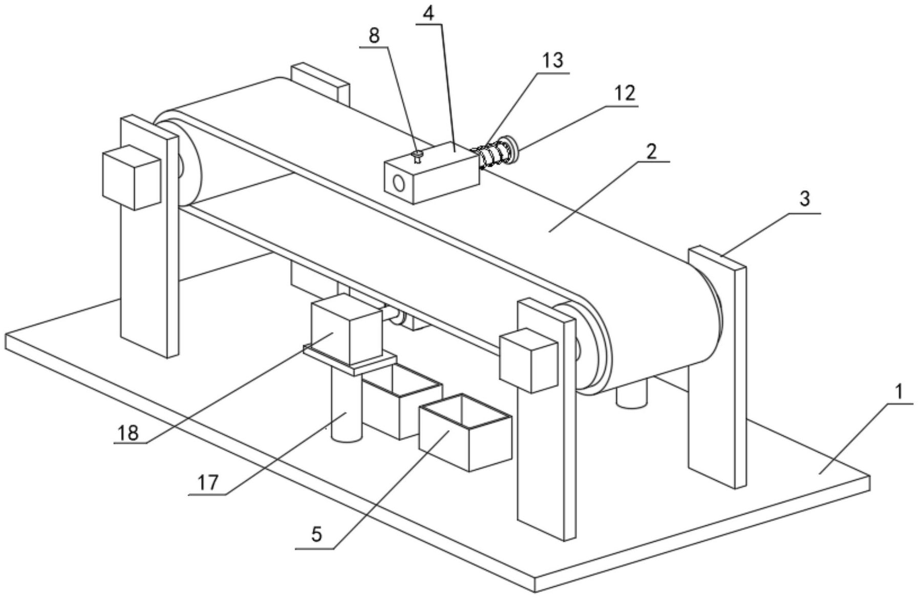 本实用新型涉及食品加工设备技术领域,具体涉及一种泡椒鸡爪切割装置,包括底板、放置块、收集箱、传送带、传送组件、放置组件、推出组件和切割组件放置块具有放置槽,放置块还具有移动槽,放置组件包括拉杆、固定块和第一弹簧,固定块与放置块滑动连接,并位于移动槽中,拉杆与放置块滑动连接,并伸入放置槽中与固定块固定连接,第一弹簧与固定块固定连接,并与放置块固定连接,且位于拉杆的外侧,通过拉杆拉动固定块移动,通过第一弹簧伸缩对固定块进行挤压,将鸡爪的脚杆固定在放置块的放置槽中,实现对不同粗细的鸡爪脚杆进行夹持固定,从而便于后续的切割工作顺利进行。