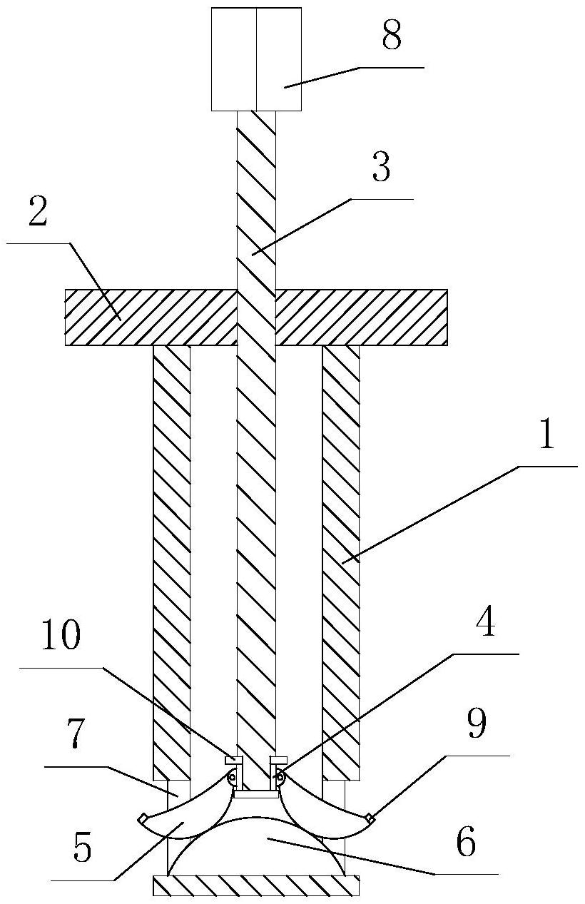 本实用新型公开了一种快易型自锁紧装置,包括护套、压板、螺旋杆、套筒、锚爪和限位球,护套中空,护套顶部固定安装有压板,压板上螺纹连接有螺旋杆,螺旋杆顶部安装有连接头,螺旋杆底部套装有套筒,套筒的外侧壁上均匀地铰接有多根锚爪,锚爪底部呈弧形,所述护套下部的侧壁上加工有供锚爪穿过的通口,通口内侧的护套底部安装有与锚爪底面接触的限位球。本实用新型通过在护套内设置螺旋杆,并在螺旋杆底部套装的套筒,通过转动螺旋杆,可使套筒上铰接的锚爪从护套的通口处伸出,用于将工字钢与钢管支架连接成整体,用于对挑梁的模具支撑,同时在挑梁模具成型后,反向转动螺旋杆,即可松开工字钢,以方便工字钢的拆卸。