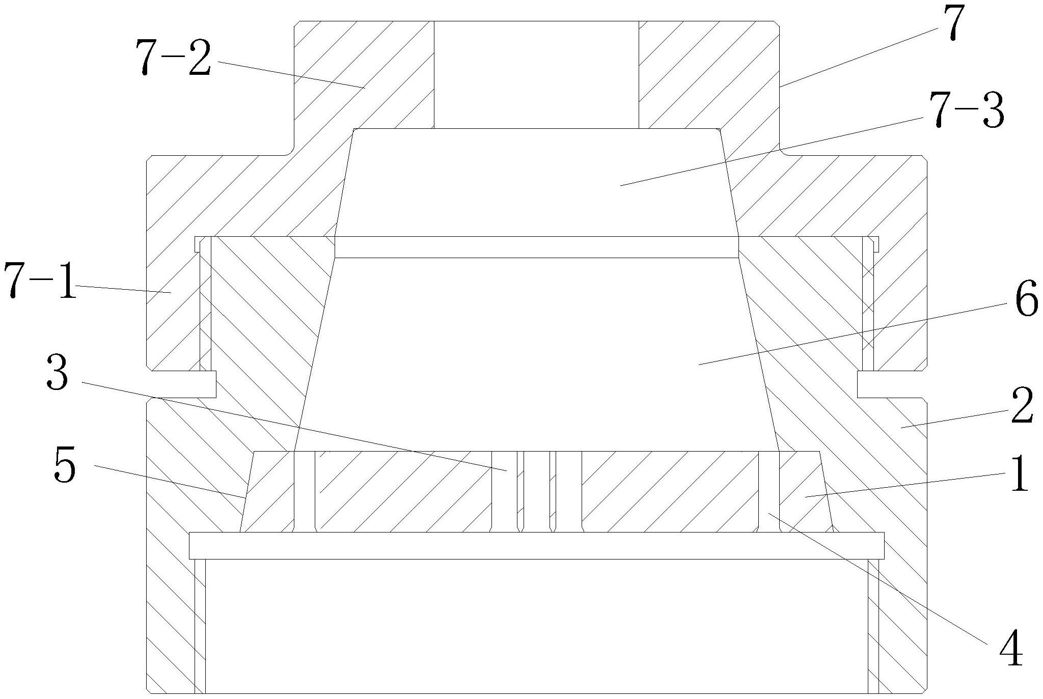 本申请公开了一种两芯电缆用的异型填充条生产装置,属于电缆加工设备领域,解决了现有两芯电缆填充条挤制过程中,因胶料压力分配不合理而导致的填充条形状不能满足成缆圆整度要求的问题,异型模设置于模座的一端开口处,模座的另一端开口与挤出机出料口连接;所述过滤板设置于模座内;所述模座内设置有渐进式模腔,渐进式模腔设置于过滤板与异型模之间,渐进式模腔靠近过滤板一端的内径至渐进式模腔靠近异型模一端的内径由大至小渐变设置。本实用新型的两芯电缆用的异型填充条生产装置,可以生产出符合要求的两芯电缆用填充条,确保在进行两芯电缆成缆时,填充条形成有效圆弧面,满足成缆的圆整度要求。