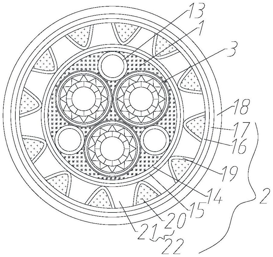 本实用新型涉及电缆技术领域,提出了一种1KV节能型防火电缆,包括从内到外依次设置的导体层、填充层和保护层,导体层包括若干个线接触的导线,每个导线包括由内到外依次设置的第一导体结构、第二导体结构和保护结构,第二导体结构绕设在第一导体结构外,第一导体结构与第二导体结构均呈圆环形,保护结构包括屏蔽层、绝缘层和铜带,第一导体结构由若干个导体块一拼接而成,每个导体块一横截面积呈梯形,相邻两个导体块一面接触,第二导体结构由若干个导体块二和导体块三拼接而成,导体块二与导体块三横截面呈三角形,导体块二与导体块三均呈环形分布。通过上述技术方案,解决了现有技术中导体材料浪费的问题。