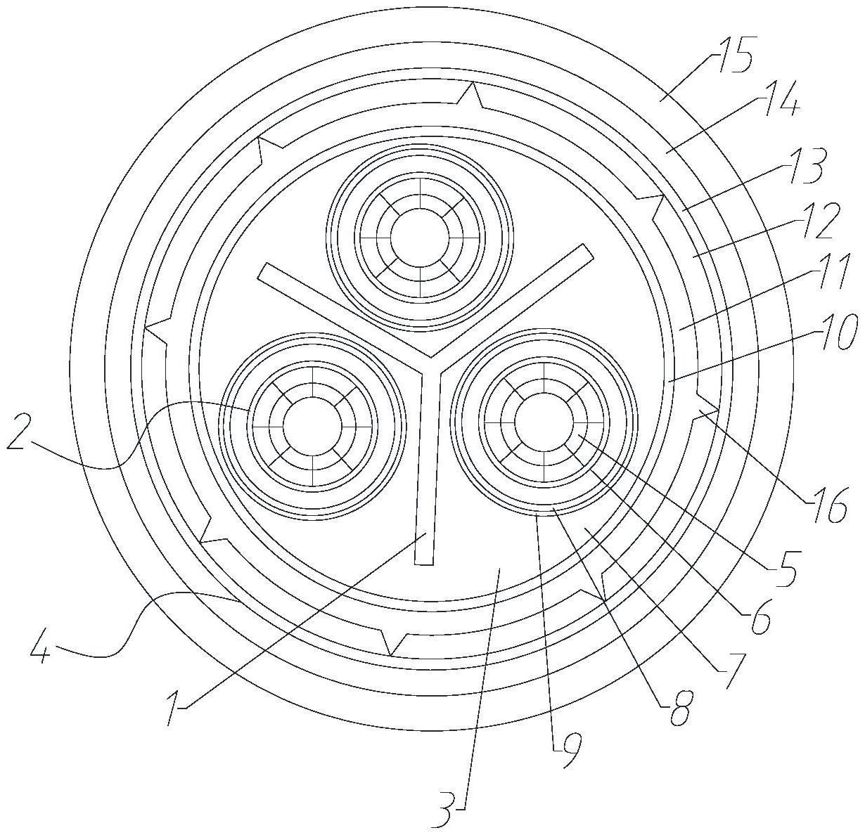 本实用新型涉及电缆技术领域,提出了额定电压10KV交联聚乙烯绝缘节能电缆,包括橡胶分隔板,将电缆内部分隔成三个夹角为120°的扇形空间,导体,共有三个,分别设置于两个相邻的橡胶分隔板之间,填充层,包裹在所述导体层外,防护层,包裹在所述填充层外,所述导体包括梯形导体层,所述梯形导体层内部形成空腔,所述梯形导体层外依次设置有导体屏蔽层、绝缘层、绝缘屏蔽层和铜带层。通过上述技术方案,解决了现有技术中需要增大导体直径来提高载流量的问题。