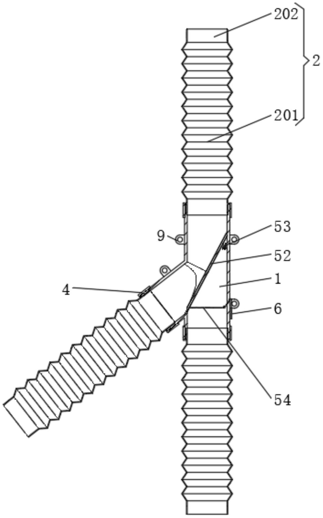 本实用新型公开了一种具备分流功能的金属软管,包括三通管、连通管组件和导流组件;三通管:其三个端头的内壁均设有环形槽,环形槽的内弧面远离三通管的一端均设有倒角,三通管的三个端头外弧面均设有螺纹;连通管组件:包括金属波纹管和硬质连接管,所述硬质连接管对称固定连接于金属波纹管的两端,所述金属波纹管有三个,三个金属波纹管的端头分别与环形槽的内壁插接;导流组件:设置于三通管的中心;其中:还包括螺纹环和密封环,所述密封环分别套接于环形槽的倒角内壁,密封环的内弧面与相邻的硬质连接管外弧面活动套接,该具备分流功能的金属软管,实现废水中固体污物和水的分离并实现分流排放,有效避免内部堵塞。