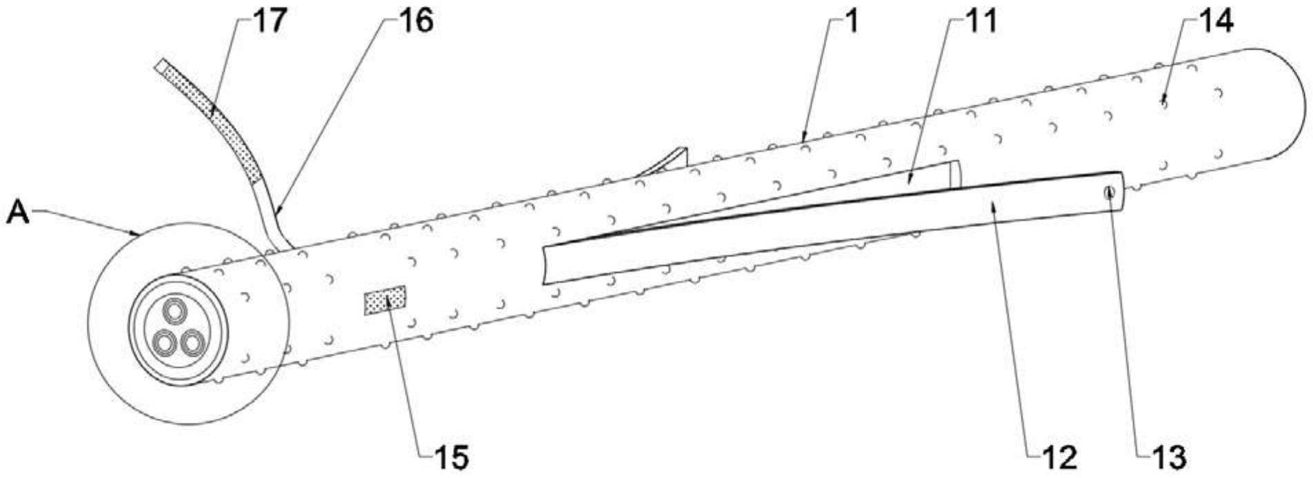 本实用新型公开了一种消防专用双阻燃型电力电缆,包括电缆本体,所述电缆本体包括外层、中层和内层,外层外表面对称开设隐藏槽,隐藏槽内设置橡胶条,且橡胶条一端固定连接橡胶层,橡胶条另一端内部开设拿取孔,外层外表面安装缠绕带,缠绕带靠近橡胶层一端设置魔术贴一,外层外表面镶嵌魔术贴二。本实用新型使用时,通过拿取孔将两橡胶条从隐藏槽内抠出来,可以将两个橡胶条系在衣服上,也可以先将电缆在腰部缠绕一圈,然后再将橡胶条系紧,使电缆一部分盘在腰间,在进行拖拽的时候不影响手里机器的使用。