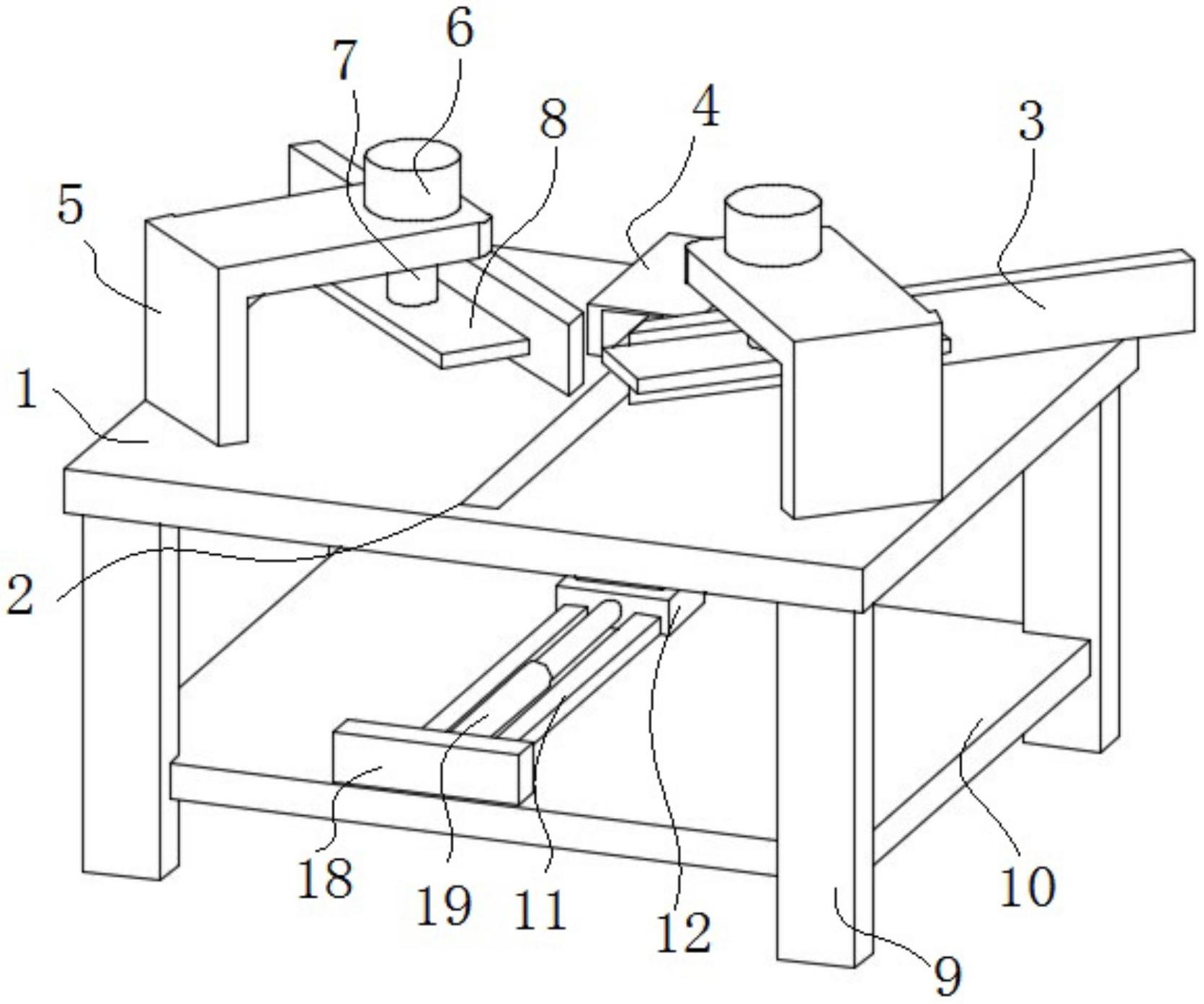 本实用新型公开了一种方便夹持的人造石斜角切角机,涉及人造石加工技术领域。本实用新型包括工作台、开口槽和切角板,开口槽设置在工作台上表面,切角板的数量为两个,两个切角板切斜安装在开口槽两侧,开口槽一端上方设置有防护罩,开口槽另一端两侧均安装有支撑板,两个支撑板均为“L”形板体结构,两个支撑板上表面均安装有推动气缸,两个推动气缸下表面均安装有推杆,两个推杆周侧面分别与两个支撑板之间滑动配合,两个推杆下表面均安装有压板,两个压板与人造石之间相互配合。本实用新型通过推动气缸和压板结构,方便夹持固定需要切角的人造石,无需人工进行固定,提高对工人操作时的安全性,同时降低了工人的工作强度,提高了工作效率。