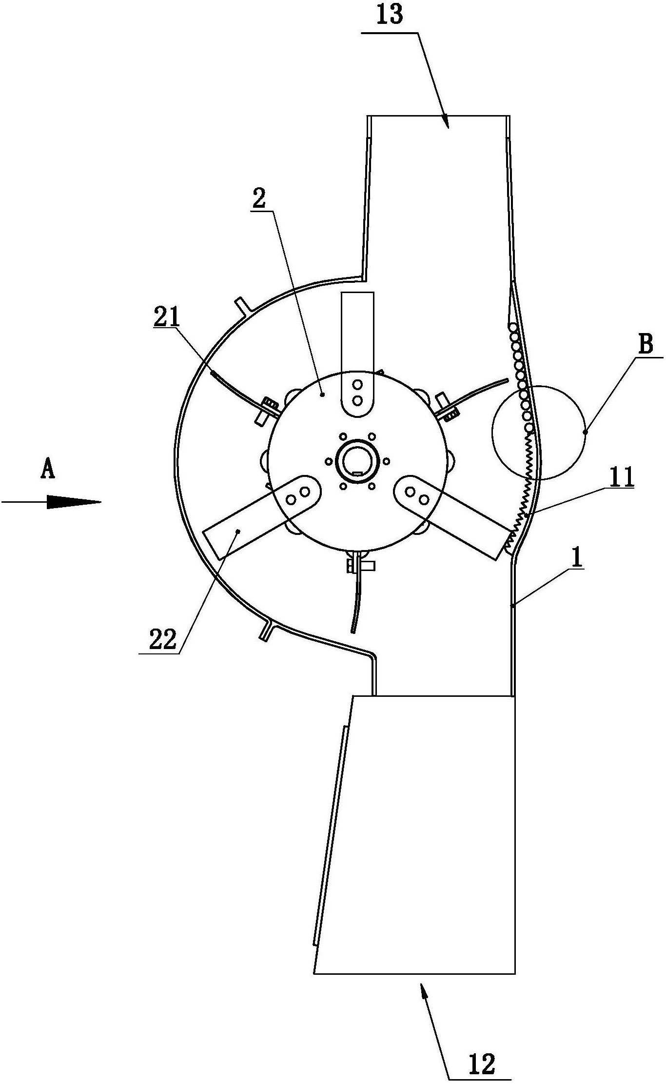 一种具有揉丝破粒功能的送料装置,涉及青饲料作物收割装置技术领域,用于对青饲料进行揉丝破粒的工作。一种具有揉丝破粒功能的送料装置,器特征是,包括送料筒、转轮、抛送叶片、若干的甩刀和若干的锯齿条,所述转轮转动连接在所述送料筒中,所述甩刀和所述抛送叶片分别设在所述转轮的圆周上,所述锯齿条设所述料筒的内壁上,各所述锯齿条的齿牙朝向所述转轮设置,各所述锯齿条沿平行于所述转轮的轴向的方向分布;所述甩刀在随所述转轮做圆周旋转的时,该甩刀的外端从其中两个相邻的锯齿条之间经过;所述抛送叶片的长宽面沿着平行于所述转轮的轴向。有益效果是,可以提高揉丝破碎效果和破粒效果。