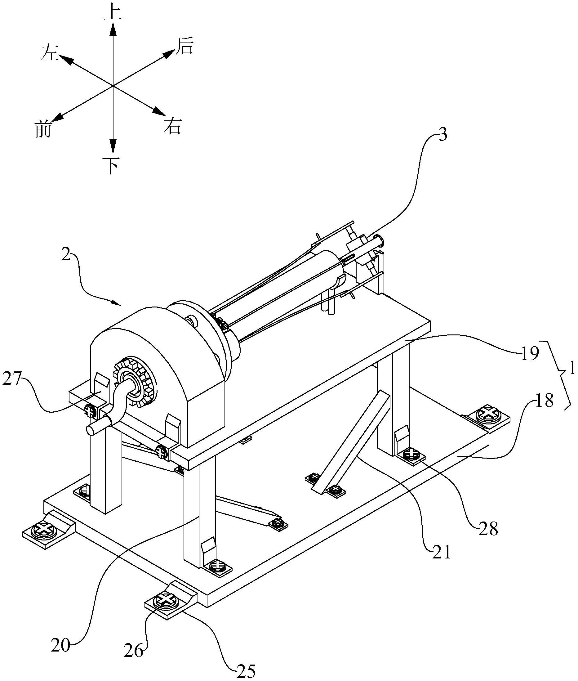本实用新型用于管桩生产技术领域,特别涉及一种管桩钢筋捆绕装置,包括基座;旋转装置,安装在基座上,旋转装置的动力输出端安装旋转盘,旋转盘上设有夹持装置;拉筋装置,拉筋装置安装在基座上,拉筋装置与基座相对布置,拉筋装置包括支撑座和多个拉板,各个拉板环向间隔设置在支撑座上,拉板上设有用于钢筋穿设的穿孔。使用过程中,将管桩的一端夹紧在夹持装置上,钢筋的一端固定在管桩上的预埋件上,另一端穿设在拉板上的穿孔中固定,然后通过旋转装置转动旋转盘,使得旋转盘带动管桩转动,进而使得各个钢筋捆绕在管桩的外周,对管桩周围进行加固处理,这种捆绕装置能够一次将多个钢筋都捆绕在管桩上,所以其在捆绕过程中效率更高、更快速。