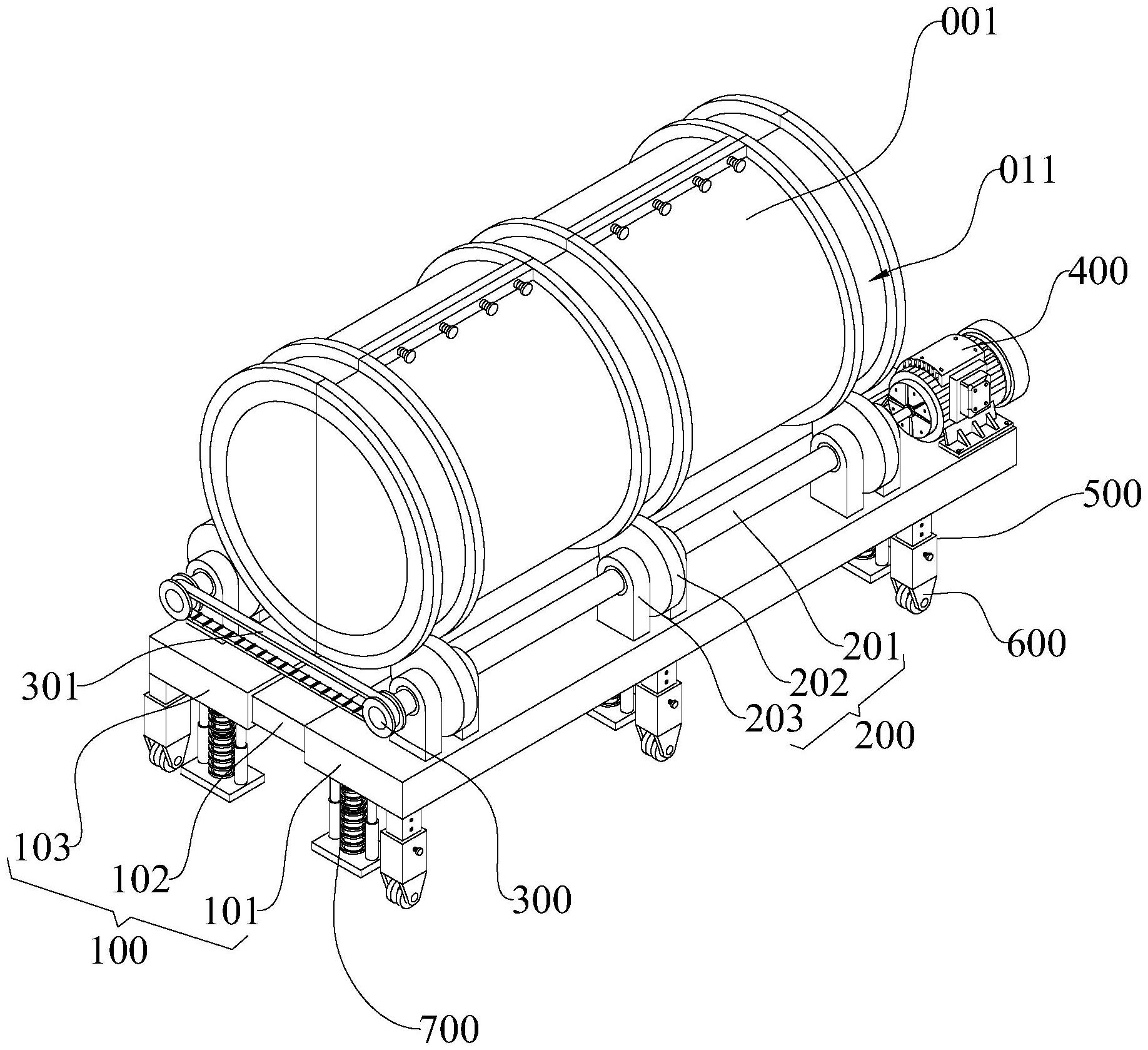 本实用新型用于管桩生产设备领域,特别涉及一种管桩生产离心机,包括底板,能够沿着宽度方向伸缩;滚动组件,件设有多组,各组滚动组件沿着底板的伸缩方向相对布置。管桩外壳内放入捆扎完毕的钢筋架,注入合适量的混凝土,将管桩外壳放置在相邻两组滚动组件之间,通过滚动组件的转动来带动管桩外壳的转动,当需要在两组滚动组件之间架设更粗的管桩外壳时,将底板拉伸,使得相邻两组滚动组件之间的间距变宽,当需要在两组滚动组件之间架设更细的管桩外壳时,将底板压缩,使得相邻两组滚动组件之间的间距变窄,这样通过调整底座来达到适应不同规格管桩外壳的作用,有效提高了管桩生产离心机的使用范围。