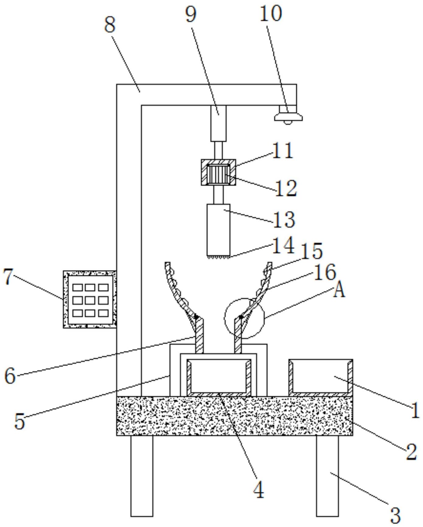 本实用新型公开了一种水果去核设备,包括工作台,所述工作台的顶部外壁通过螺钉固定有支撑杆,且支撑杆的顶部外壁通过螺钉固定有连接管,所述连接管的四周外壁均铰接有电动伸缩杆,且电动伸缩杆活塞杆的一端铰接有弧形板,所述弧形板的内壁粘接有橡胶凸起,所述工作台顶部外壁的一侧通过螺钉固定有L形结构的支撑柱,且支撑柱远离工作台一端的底部外壁通过螺钉固定有液压缸,所述液压缸活塞杆的一端通过螺钉固定有安装块,且安装块的底部外壁开设有安装槽,所述安装槽的内壁通过螺钉固定有伺服电机。本实用新型起到良好的去核效果,提高了果核的去除效率,安全性能较高,满足人们的使用需求。