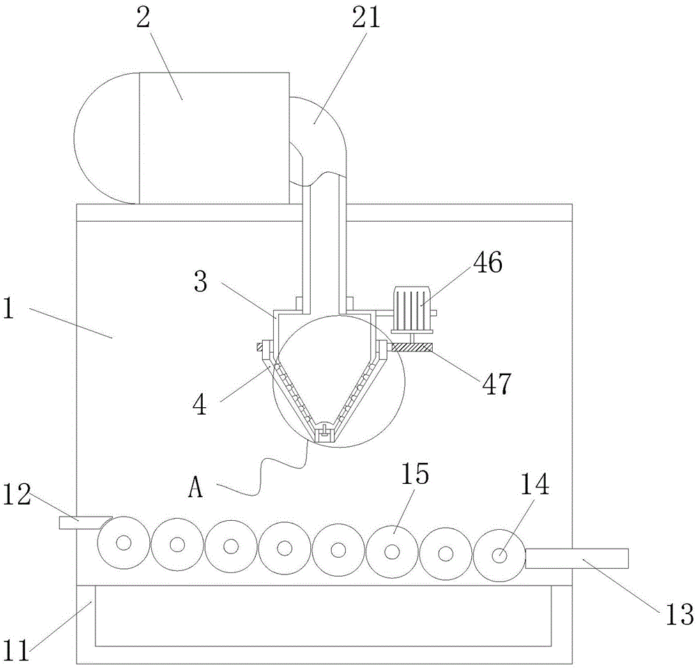 本实用新型属于食品加工技术领域,尤其一种食品加工用高温喷淋式杀菌机,包括中空结构的机体、安装在所述机体上表面的热水器以及设置在所述机体内的喷头和转动连接在所述喷头上的封堵壳,所述机体的底面内壁固定连接有储水槽,所述机体的内壁靠近所述储水槽上方的位置处固定连接有进料板和出料板,所述机体的内壁位于所述进料板和所述出料板中间的位置处固定连接有固定轴,所述固定轴的外壁转动连接有金属棍;由于封堵壳内的橡胶挡条对部分喷孔进行封堵,从而使得只有部分的喷孔能喷出热水,电机的输出轴带动齿轮转动,从而带动封堵壳外侧齿轮转动,使得封堵壳在喷头的表面转动,从而使得喷头螺旋喷洒热水,从而使得喷头的喷洒面积更广。