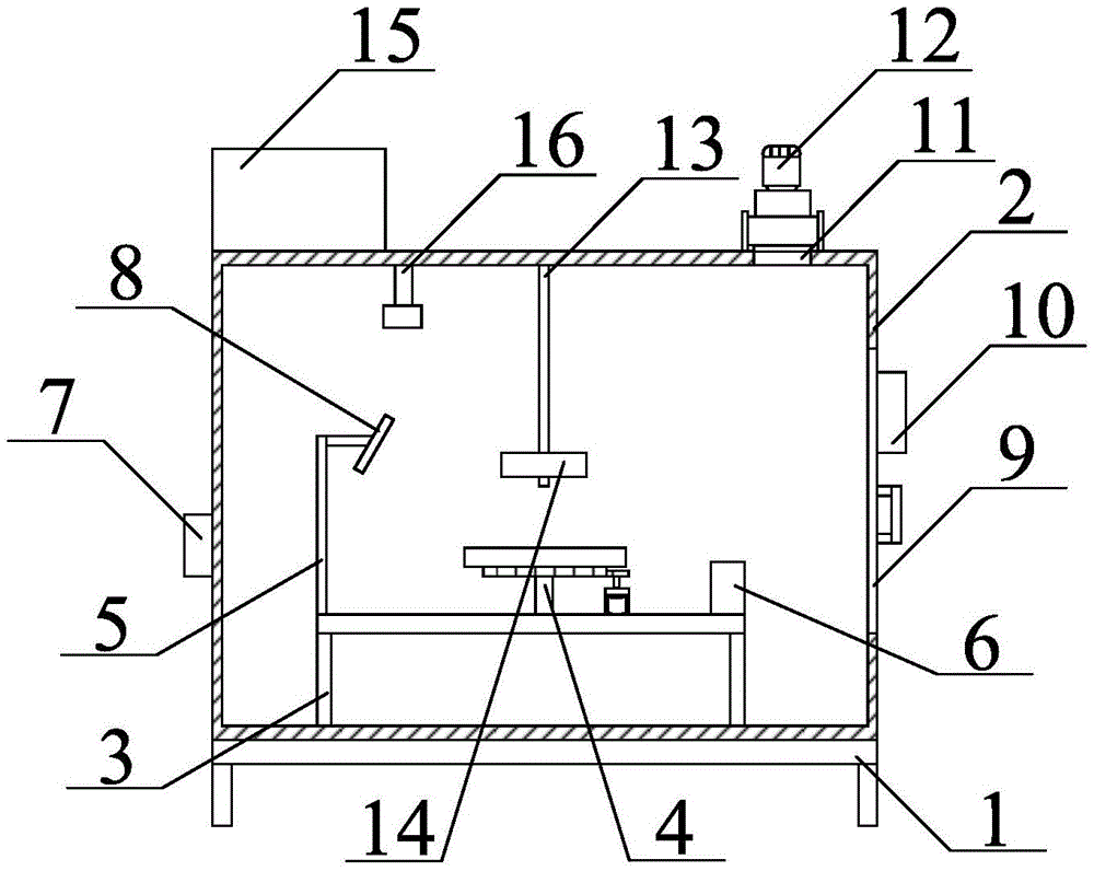 本实用新型提供一种食品防霉变检测仪,包括底座,箱体,支撑架,旋转机构,支撑杆,荧光分析仪,电控柜,紫外线发生器,活动门,控制电脑,通气阀,通气风机,滑杆,荧光接收器,蒸汽发生器和蒸汽管,本实用新型旋转机构,荧光分析仪和蒸汽发生器的设置,将食品放置在装转盘的中间位置,通过电机带动旋转盘转动,有效的提高了设备检测的准确率,通过紫外线发生器对食品的照射,如果食品发生霉变会产生黄曲霉毒素,在紫外线的照射下会发出荧光,传输到荧光分析仪进行分析,达到对食品霉变的检测,食品检测完毕后,避免检测食品中含有细菌在空气中残留传递到下一次检测的食品,引起食品的变质,采用高温杀菌的方式对检测仪进行消毒杀菌。