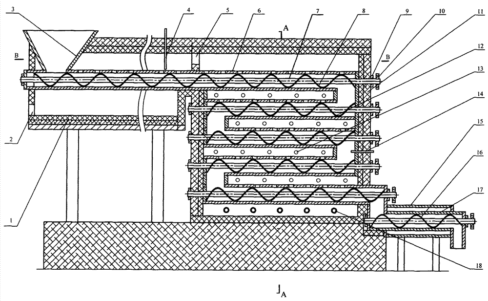 一种粉状废活性炭的卧式连续再生设备,它由烘干炉、再生炉和冷却出料管三部分构成,具体由废炭烘干炉、烘干尾气出口、原料加料斗、再生尾气出口、再生管、原料输送螺旋轴、螺旋页、螺旋轴套、传动链轮、再生设备壳体、进风孔、烘干炉和再生炉测温探头、冷却水夹套、出料螺旋、出料管、燃气烧嘴及进风管所组成。烘干炉内安装一层多根水平排列的干燥管,在再生炉中设置多排多层再生管,干燥管与再生炉的最高层再生管连成一体,原料通过输送螺旋依次输送到下一层再生管,废炭在干燥管和再生管中移动。废炭在干燥管中烘干后用螺旋输送到再生管被加热再生,挥发的可燃气体从再生管中逸出燃烧以加热上排的再生管,高温再生尾气被用来烘干废活性炭原料。