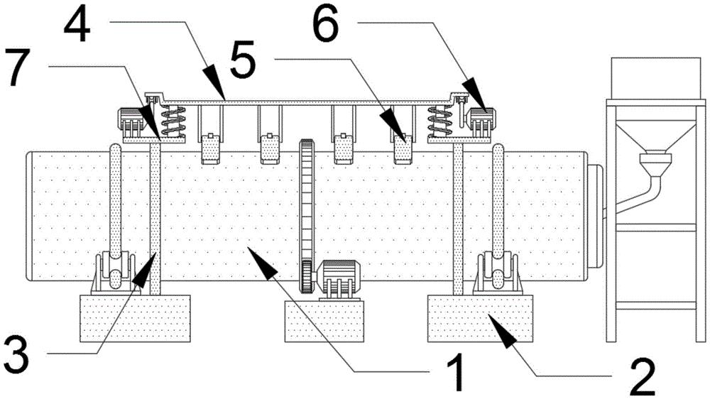 本实用新型公开了一种新型震动式防粘结再生活性炭焙烧炉,包括炉体、支座、支架、升降架、振动器、同步电机、顶板、升降器、压力弹簧、凸轮和顶轮,所述炉体底部对称设有支座,且炉体转动支撑在支座顶部,所述支座顶部位于炉体两侧对称固定有支架,且支架顶部固定有顶板,所述顶板安装有升降器,所述炉体上方设有升降架,且升降架与升降器连接固定,所述升降器外侧套设有压力弹簧,且升降架通过压力弹簧与顶板弹性连接,此再生活性炭焙烧炉通过同步电机的驱动传动使带动稳定升降,配合的弹力使快速击打,使内壁粘接的活性炭脱落,提高提高对活性炭的焙烧效率,增加加工精度,而且装置使用稳定,安全性高。