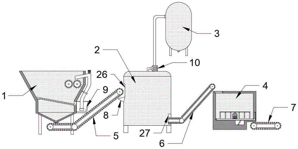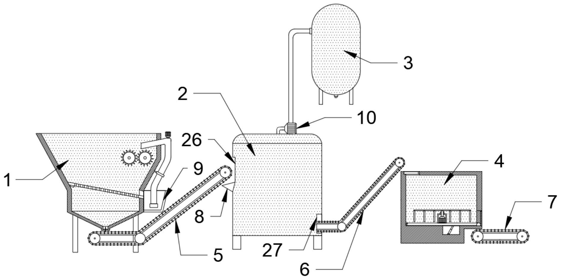 本发明公开了一种新型环保再生活性炭生产线,包括筛选箱、高温箱、液化箱、活化箱、第一传送带、第二传送带、第三传送带、回收箱、气泵、绞龙输送机、安装架、主动粉碎轮、从动粉碎轮、筛选排料口、筛网、粗料口、主动齿轮、从动齿轮、转动电机、十字转板、橡胶隔板、高温进料口、高温出料口、活化进料口、活化出料口、推料板、安装槽、液压缸、驱动电机、搅拌杆和密封箱,所述筛选箱内部倾斜安装有筛网,所述筛选箱侧壁位于筛网最低端处开设有粗料口,此再生活性炭生产线通过筛选箱将板结和粘连的活性炭进行破碎,提高加工精度和活性炭质量,而且十字转板与橡胶隔板的间歇接触实现有规律的定量排料,提高加工效率,避免散料。