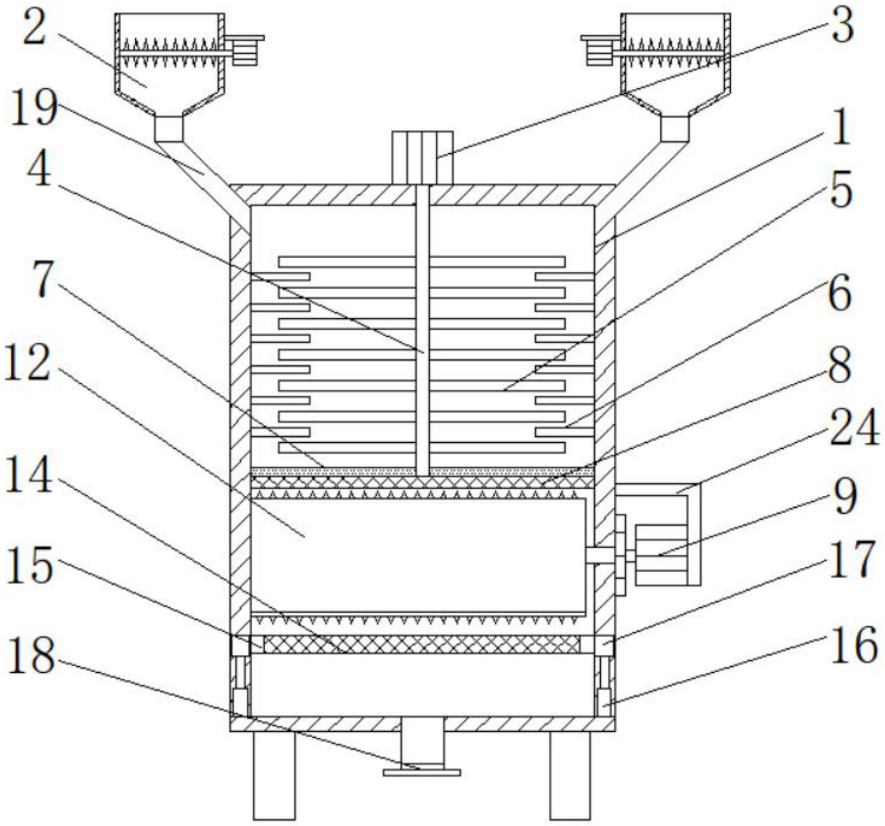 本实用新型公开了一种西洋参高破壁率超微粉碎机,包括机体,所述机体顶部对称固定连接有进料管,两个所述进料管的顶部均固定连接有预粉碎装置,所述机体的内壁分别固定连接有第一滤网和滑动连接有第二滤网。本实用新型中,通过设置的预粉碎装置,经过预粉碎后的物料再在重力的作用下进入机体的内部,然后继续被一级粉碎装置和二级粉碎装置接着粉碎,避免了较大块的参体容易卡死在进料口位置的问题,第二滤网能够通过第一吸铁石和第二吸铁石的之间的吸力配合电动推杆上下振动,有利于成品的粉末落至机体的底部,提高出料效率。