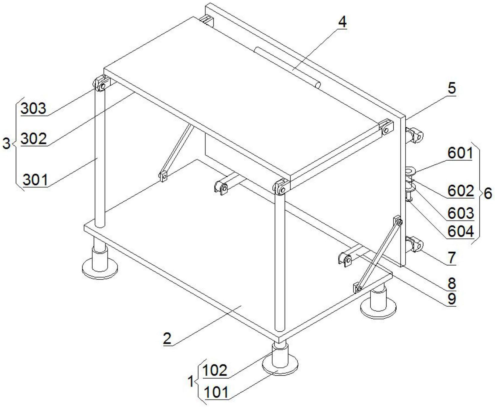 本实用新型公开了可移动可折叠安全讲评台,属于建筑工程技术领域。可移动可折叠安全讲评台,包括底板,所述底板的一侧通过连接柱活动连接有背景板,所述背景板的外侧面固定安装有万向轮,所述背景板的内侧面转动连接有固定卡块,所述底板的上表面设有支撑杆,所述支撑杆包括转动连接在底板上表面的边缘处支撑杆本体,所述支撑杆本体的另一端固定连接有U形卡板,所述U形卡板卡接在固定卡块的外表面,所述背景板的内侧设有防护装置;本实用新型,在能够保证演讲人员的安全同时,还能在施工作业完成后,便于折叠移动,避免了拆除安全讲评台,节省了讲评台原材料,能够实现循环利用。