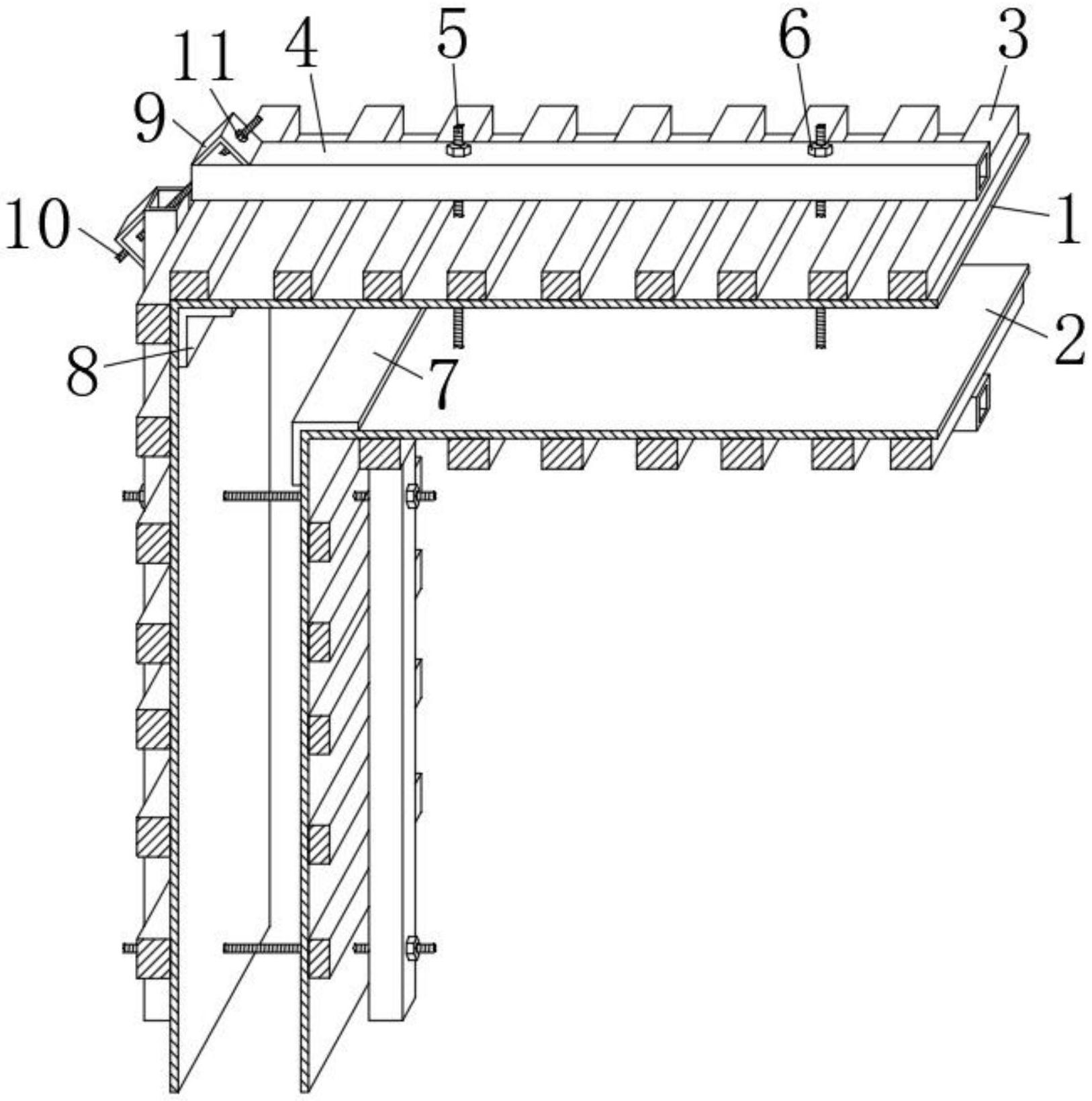 本实用新型提供一种墙体阴阳角施工加固件,涉及建筑施工技术领域,包括第一面板和第二面板,第二面板设置在第一面板的一侧,第一面板与第二面板相远离的一侧均等距设置有第一背楞,对应的第一背楞远离第一面板或者第二面板的一侧之间均设置有第二背楞,第一面板与第二面板之间设置有穿墙螺栓,穿墙螺栓的两端均贯穿对应的第二背楞,穿墙螺栓的两端且位于第二背楞的一侧均螺纹连接有第一紧固螺母。本实用新型结构紧凑,实用性强,替代传统的加固施工结构,将钢木混合做背楞,依靠穿墙螺栓固定该结构,具有结构整体性能好,制作墙面平整、模板周转快、一次投资少、劳动强度低、技术较易掌握的优点,有利于实际的应用。