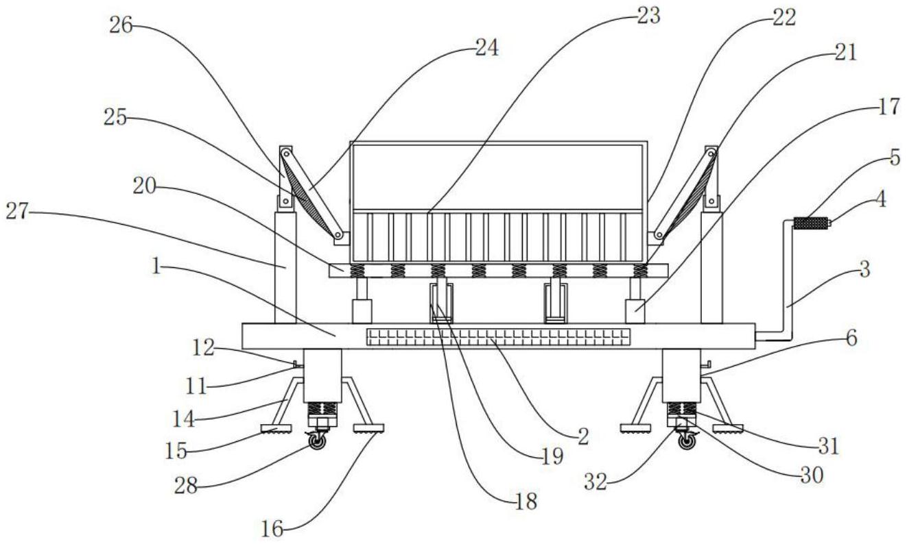 本实用新型公开了一种建筑工程支撑装置,包括底板、制动部件和减震箱,底板的底部安装有制动部件,制动部件的内部开设有空腔,空腔的顶部和底部均设有固定板二,两个固定板二之间转动连接有螺纹杆,螺纹杆的外壁设有第一锥齿轮,第一锥齿轮的外壁啮合连接有第二锥齿轮,第二锥齿轮远离螺纹杆的一侧转动连接有转轴,转轴穿设于制动部件的侧壁,螺纹杆的外壁螺纹连接有螺纹筒,螺纹筒的侧壁均焊接连接有支撑腿。本实用新型有效的增大装置与地面的接触面积,使装置更加稳固,防止倾倒,提高了工作人员的安全性,便于工作人员对于不同高度建筑进行施工,对支撑板上的工作人员和重物进行有效的缓冲减震,延长装置的使用寿命。