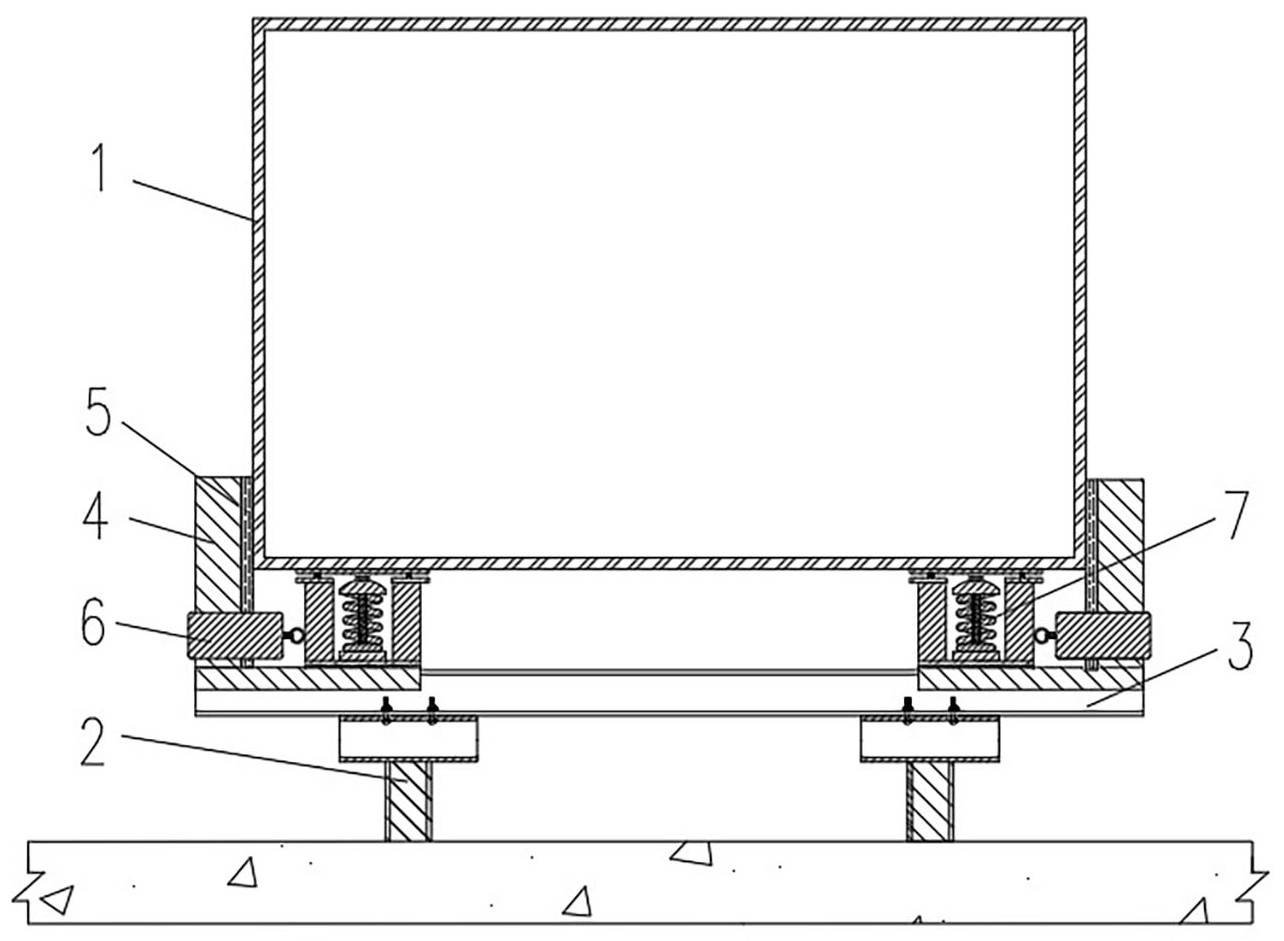 本实用新型公开了一种落地式风管减震支架,用于固定风管,包括固定座、支撑横梁、定位架、减震垫和减震器;所述固定座设置在地面上;所述支撑横梁设置在固定座上;所述定位架设置在风管两侧的支撑横梁上,为L型结构,包括横板和立板;所述减震垫设置在定位架的立板上,并与风管侧面接触;所述减震器设置在定位架的横板上,并与风管底面接触。本实用新型通过设置减震垫和减震器,实现风管在竖直方向和左右方向的减震,满足风管落地安装的减震要求;定位架能够与支撑横梁上不同位置的螺栓孔连接,实现定位架在支撑横梁上的位置调节,进而适应不同安装位置、安装位置存在偏差或不同尺寸风管的施工情况,降低安装精度要求,提高支架的适用范围。