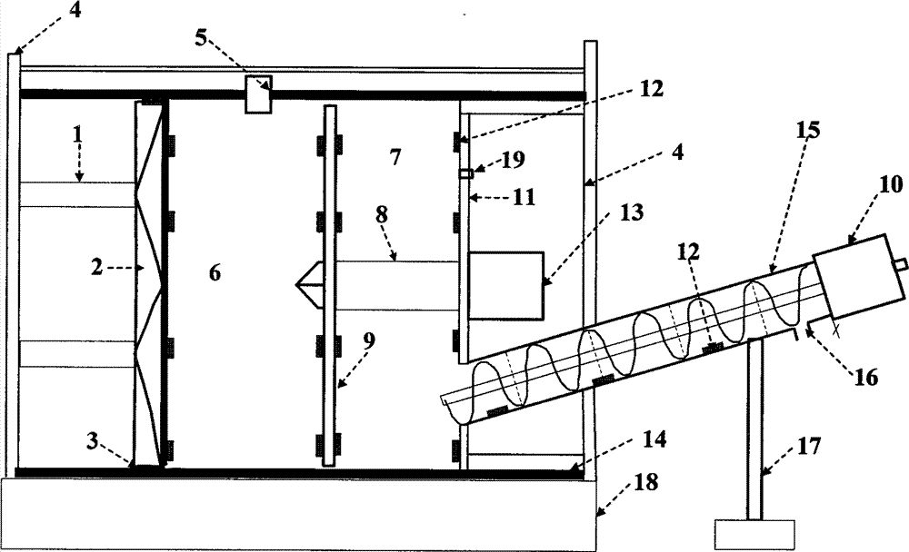 本发明公开了一种土压平衡盾构渣土压力控制的模型试验装置。该模型试验装置主要包括桁架式加载系统、刀盘、密封舱、螺旋输送机、压力传感器系统。桁架式加载系统通过千斤顶与反力架相连,千斤顶的顶进实现开挖面加载;刀盘、螺旋输送机由电机驱动;压力传感器布置在密封舱隔板及螺旋输送机外壳不同位置;PC软件经数据采集仪进行压力数据的监测。该装置可以实现在不同改性渣土、密封舱压力或螺旋输送机转速下,通过监测密封舱隔板和螺旋输送机典型位置渣土压力,探明土压平衡盾构密封舱及螺旋输送机内渣土压力传递机理,建立开挖面压力与密封舱隔板压力之间的映射关系及螺旋输送机进出口压力变化关系,指导土压平衡盾构施工。