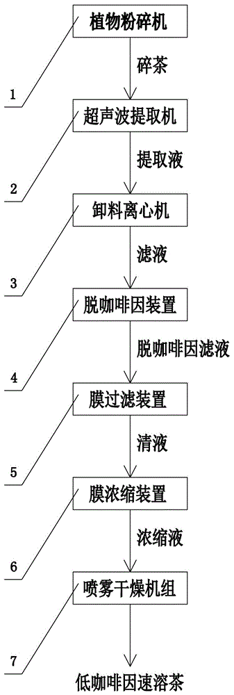 一种低咖啡因速溶茶的生产线,包括植物粉碎机、超声波提取机、卸料离心机、脱咖啡因装置、膜过滤装置、喷雾干燥机组。本生产线流程简单,并且脱咖啡因效果显著,能够使得速溶茶产品中的咖啡因含量低于1%,从而减少了过量摄入咖啡因对人体的危害,扩大了速溶茶的适用面,男女老少皆宜。另外,通过对传统的脱咖啡因装置进行改进,使得冷却水能够更为快速地与釜体内的液体进行热交换,从而提高咖啡因吸附剂的放热效率,进而提高咖啡因吸附效果,并且便于运输和后续的维护保养。