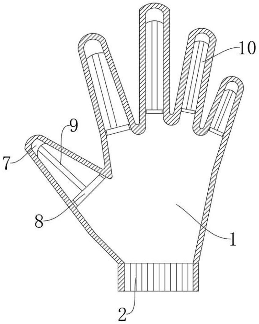 本实用新型涉及防护用品技术领域,具体为一种可快速穿戴的肉类加工用防割手套,包括本体以及本体上的五个指套,本体的底端设置有松紧带,松紧带的外壁设置有连接组件,连接组件与松紧带的另一端连接,每一个指套的内腔均设置有防止指套内壁贴合的支撑组件,每一个指套的前端和后侧分别设置多个凸点和保护层。该可快速穿戴的肉类加工用防割手手套解决了手套在使用的时候不方便穿戴,需要耗费一定时间的问题。