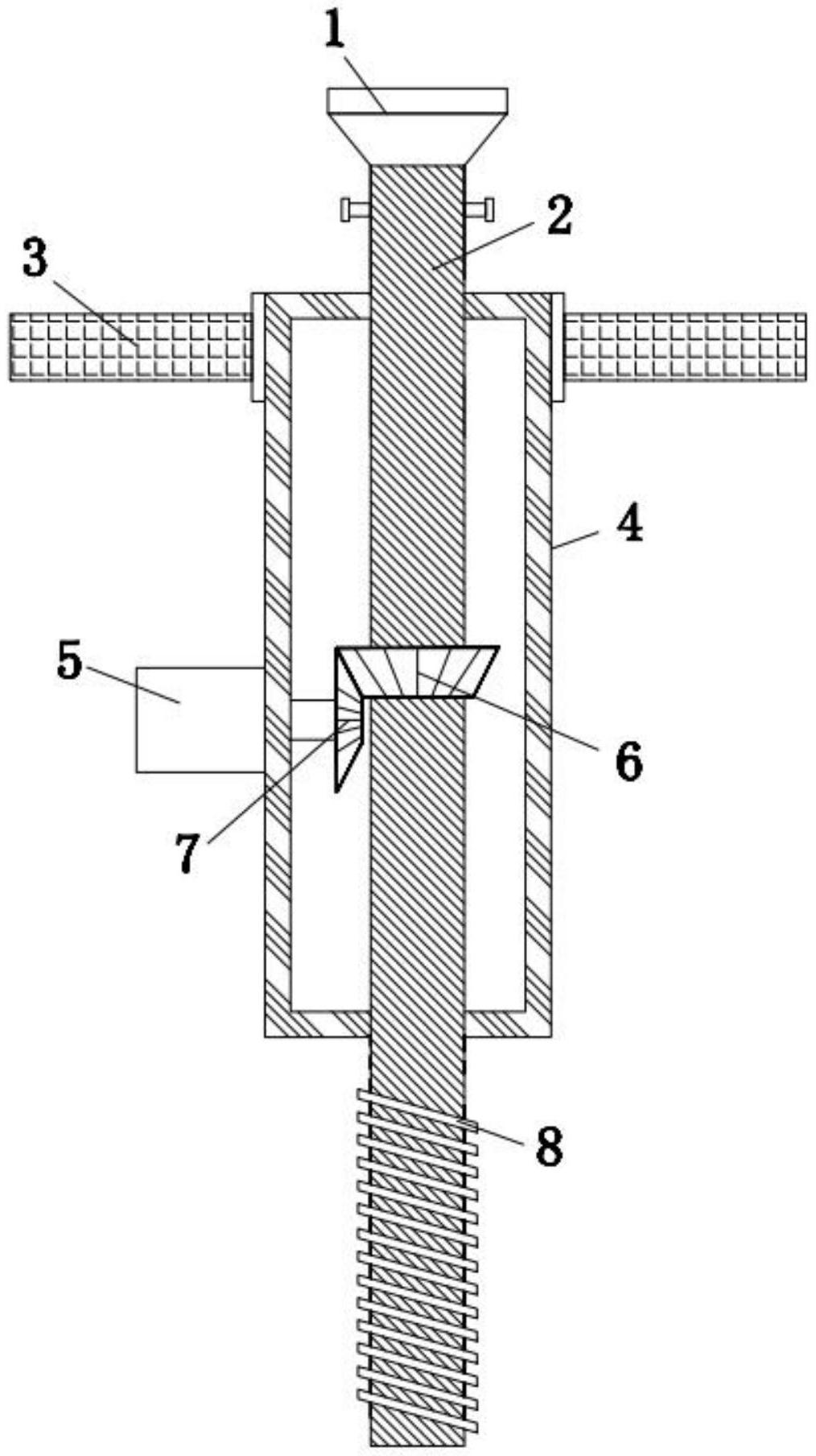 本实用新型公开了一种用于茶苗种植的辅助固定结构,包括旋转筒、壳体、固定板和加强层,壳体的内部设置有旋转筒,且旋转筒的顶端延伸至壳体的外部,壳体两侧的顶端均设置有手柄,旋转筒的顶端设置有投苗口,且旋转筒侧壁的内部设置有加强层,加强层两侧的旋转筒内均设置有抗压层,旋转筒顶部的两侧均穿过有操作杆,且操作杆的一端均设置有固定板。本实用新型通过安装有壳体、手柄、旋转筒、投苗口、微型电机、第一齿轮、第二齿轮以及螺纹齿,使得在种植茶苗时将旋转筒底部与土层接触,同时手持手柄处并向下压,利用底部的螺纹齿进行钻孔,无需额外使用打孔设备,方便快捷。