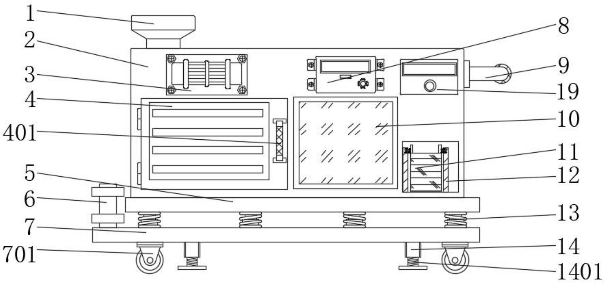 本实用新型公开了一种红茶除杂称重包装一体化加工装置,包箱体、减震板和底座,所述底座底部的两侧固定安装有车轮,所述底座的顶部固定安装有减震板,且减震板与底座之间固定安装有减震弹簧,所述减震板的顶部固定安装有箱体,所述箱体的表面固定安装有振动电机,所述隔板一侧的箱体内部固定安装有筛分板,所述固定座的顶部固定安装有称重传感器,所述称重传感器一侧的固定座顶部固定安装有电推杆,且活动杆之间的称重传感器顶部活动安装有放置架,所述固定座另一侧的箱体内部固定安装有固定杆。本实用新型通过设置有一系列的结构使本装置在使用的过程中能够增加对红茶的除杂效果,减小了装置运行时产生的噪音。
