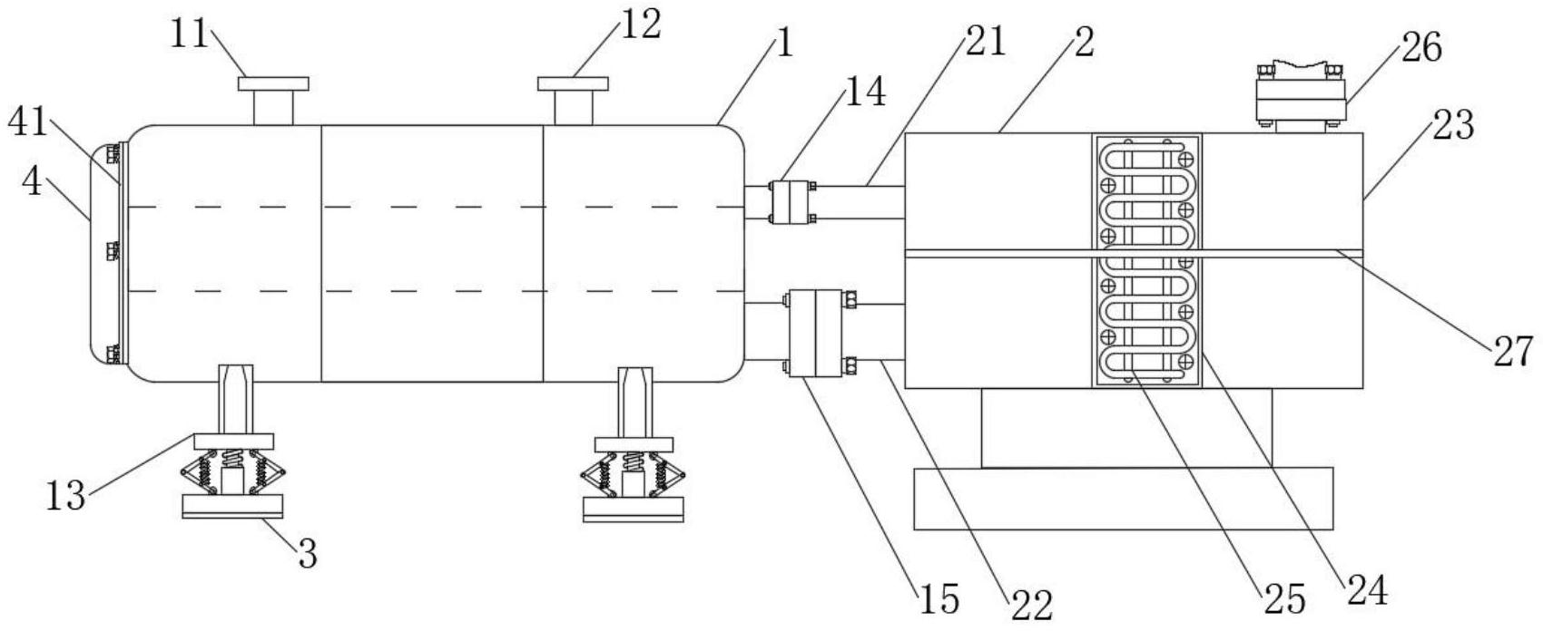 本实用新型涉及化工热交换领域,具体为一种化工用节能热交换装置,包括机器主体、循环机构、减震机构和拆卸机构,所述机器主体包括出水口与入水口,所述出水口与入水口的右侧安装有循环机构,所述循环机构包括第一传水管,所述出水口的右侧安装有第一传水管,所述入水口的右侧安装有第二传水管。本实用该采用在装置外侧进水口与出水口处,安装法兰连接循环利用箱,采用冷凝降低水温,并且采用滤网过滤杂质,再从进水口传入循环利用,并且在装置的下方安装有减震机构,在装置的前端设置有可拆卸机构,方便打开进行保养维修,达到了水资源循环利用,且装置具有减震,减少损伤,并且方便保养的效果。