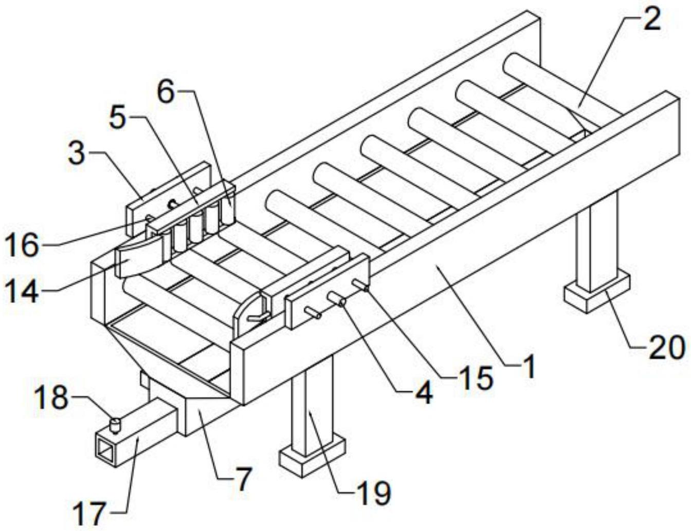 本实用新型涉及一种炼钢安全输送辊,包括对称设置的两组固定架,两组固定架之间转动安装有多组输送辊轴,固定架的外侧配合输送辊轴设置有驱动机构,每个固定架上配合输送辊轴均设置有限位板,每个限位板上均设置有电动推杆,电动推杆的输出端设置有导向架,导向架上竖直且转动安装有多个导向辊,固定架的底端配合输送辊轴设置有收集箱,收集箱的内部底端转动设置有螺旋输送轴,收集箱的侧壁上配合螺旋输送轴设置有第一电机,本实用新型对于炼钢生产过程中轧钢板的输送稳定性好,且便于实现轧钢板输送过程中碎屑的收集和处理。